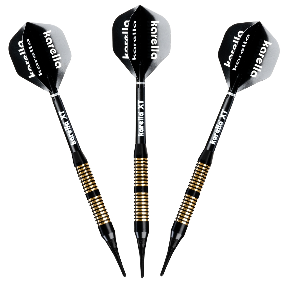 Die Karella XT-Serie als Steel- und Softdart verbindet Design und Qualität bei einem unschlagbaren Preis-Leistungs-Verhältnis. Der Karella XT-6 Soft sorgt mit seiner eleganten Erscheinung für Aufsehen am Board. Der hochwertig beschichtete schwarz- und goldfarbene Messignbarrel bietet dem Spieler einen einfachen, aber effektiven Grip. Dank der ausgeprägten Ringstruktur liegt der Dart sehr gut in der Hand. Kombiniert mit den farblich passenden 100 Mic. starken XT-Profi Flights sowie den schwarzen Karella XT-Schäften (Medium) stellt der XT-6 nicht nur optisch ein absolutes Highlight dar. Verpackt ist das Set in einem schönen Blister inklusive Darthalter. Karella XT Serie – Ideal für Einsteiger und Hobbyspieler.