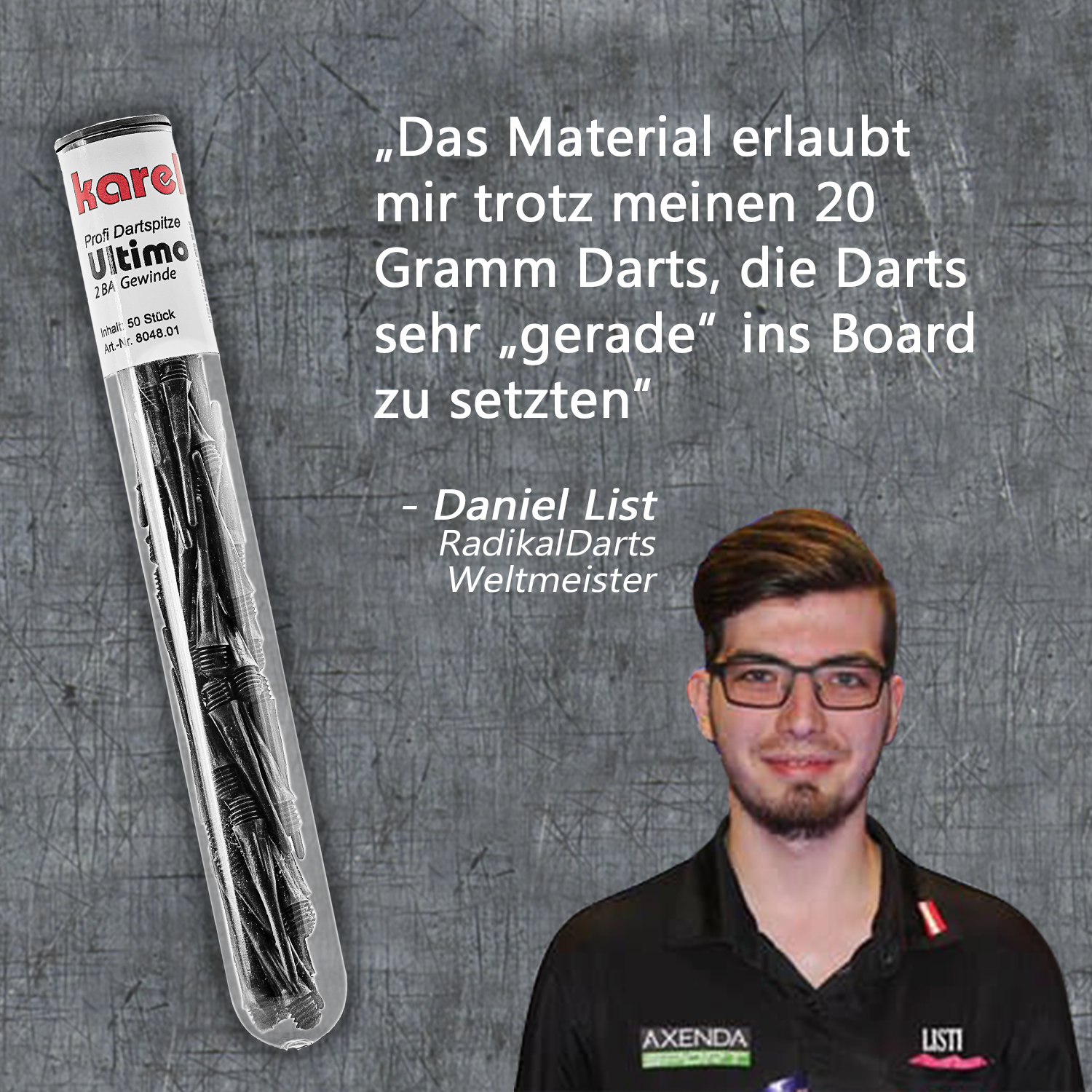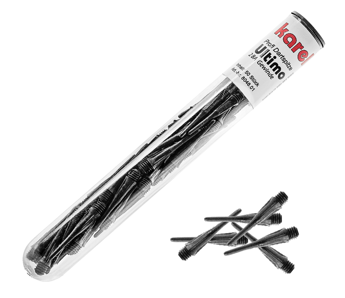 Die Karella „Ultimo“ Dartspitzen gehören zu den besten Softspitzen weltweit. Langjährig wurde das Material, welches aus zwei Komponenten besteht, im Kunststofflabor entwickelt. Diese High-Tech Dartspitze ist besonders formstabil und bruchsicher und garantiert eine hohe Lebensdauer. Die konisch verlaufenden Stege versteifen zusätzlich den Korpus, sodass es zu keiner ungewollten Verformung kommen kann. Durch die griffigen Stege kann man den Dart an der Spitze sehr leicht aus dem Dartboard herausdrehen. Die spezielle Form im vorderen Spitzenbereich sorgt für den absolut sicheren Halt im Board. Das 2 BA Gewinde ist äußerst präzise gedreht und sorft damit für besonders festen Halt im Barrel. Außerdem verhindert dies das ungewollte Herausdrehen beim Spiel. Diese Karella Ultimo Spitzen haben die ideale Länge von 24 mm (ohne Gewinde) und sind in der Farbe schwarz erhältlich. Verpackt sind die 50 St. in einer praktischen transparenten PVC-Tube.