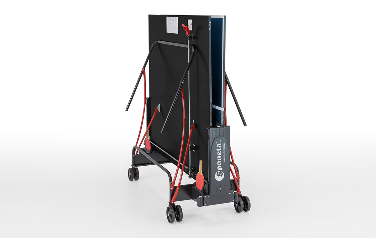 Die Sponeta Tischtennisplatten sind alle in Deutschland produziert und überzeugen durch hervorragende Qualität und perfekte Spielbedingungen. Durch die hochwertige Beschichtung der Feinspanplatte wird ein optimaler Ballabsprung garantiert, wodurch auch professionelle Tischtennisspieler voll und ganz auf ihre Kosten kommen. Alle Modelle werden mit einem passenden Netz ausgeliefert und entsprechen den offiziellen Turniermaßen von einer Länge von 274 cm, Breite von 152,5 cm und einer Höhe von 76 cm. Die Tische unterscheiden sich im wesentlichen durch das Untergestell, den Klappmechanismen, der Plattendicke und dem Gewicht. Das Highlight ist das SMS Verriegelungssystem. Das dem Bediener es ermöglicht den Tischtennistisch blitzschnell auf und ab zu bauen. Die Abkürzung steht für Smart Manual System, das seinem Namen alle Ehre macht und durch einen pfiffigen Mechanismus überzeugt.