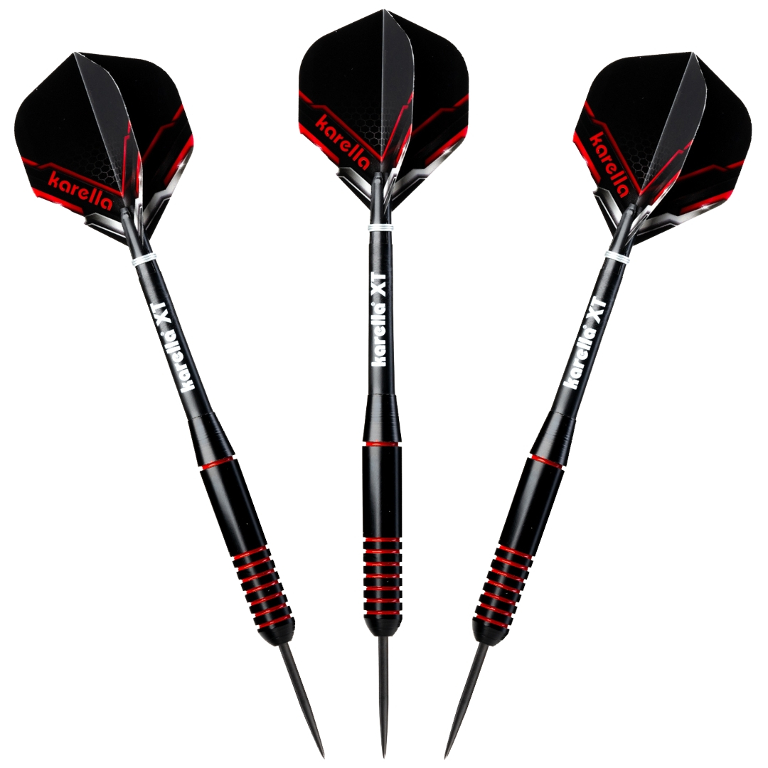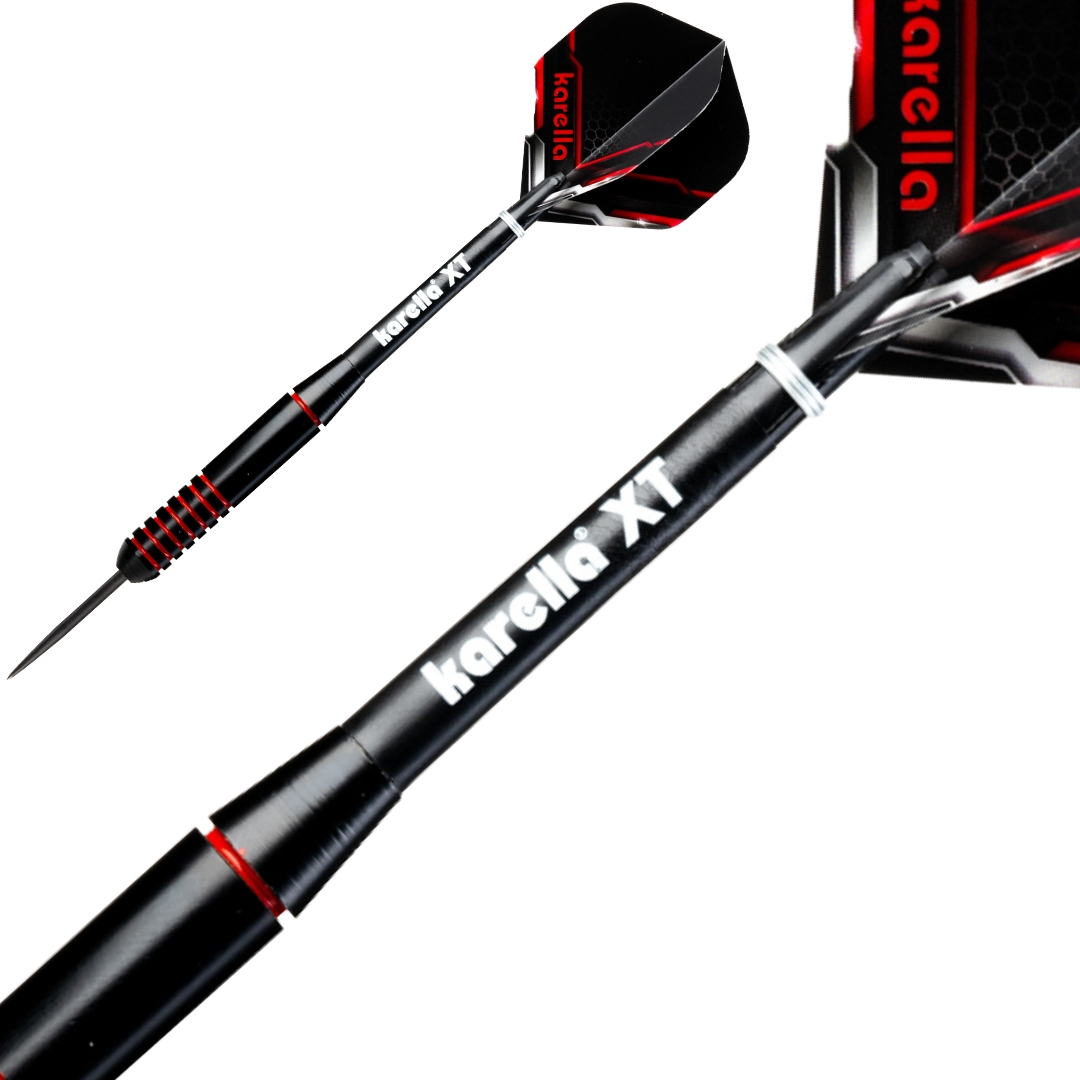 Die Karella XT-Serie als Steel- und Softdart verbindet Design und Qualität bei einem unschlagbaren Preis-Leistungs-Verhältnis. Der XT-2 Steel ist ein echter Hingucker am Dartboard! Der schwarz beschichtete, gerade Barrel des XT-2 Steel ist mit seinen rot gefärbten Griffrillen in den klassischen Karella Farben gehalten. Der perfekt ausbalancierte Dart liegt perfekt in der Hand und überzeugt durch erstklassige Flugeigenschaften. Kombiniert mit den farblich passenden 100 Mic. starken XT-Profi Flights sowie den schwarzen Karella XT-Schäften (Medium) stellt der XT-2 Steel nicht nur optisch ein absolutes Highlight dar. Verpackt ist das Set in einem schönen Blister inklusive Darthalter. Karella XT Serie – Ideal für Einsteiger und Hobbyspieler.