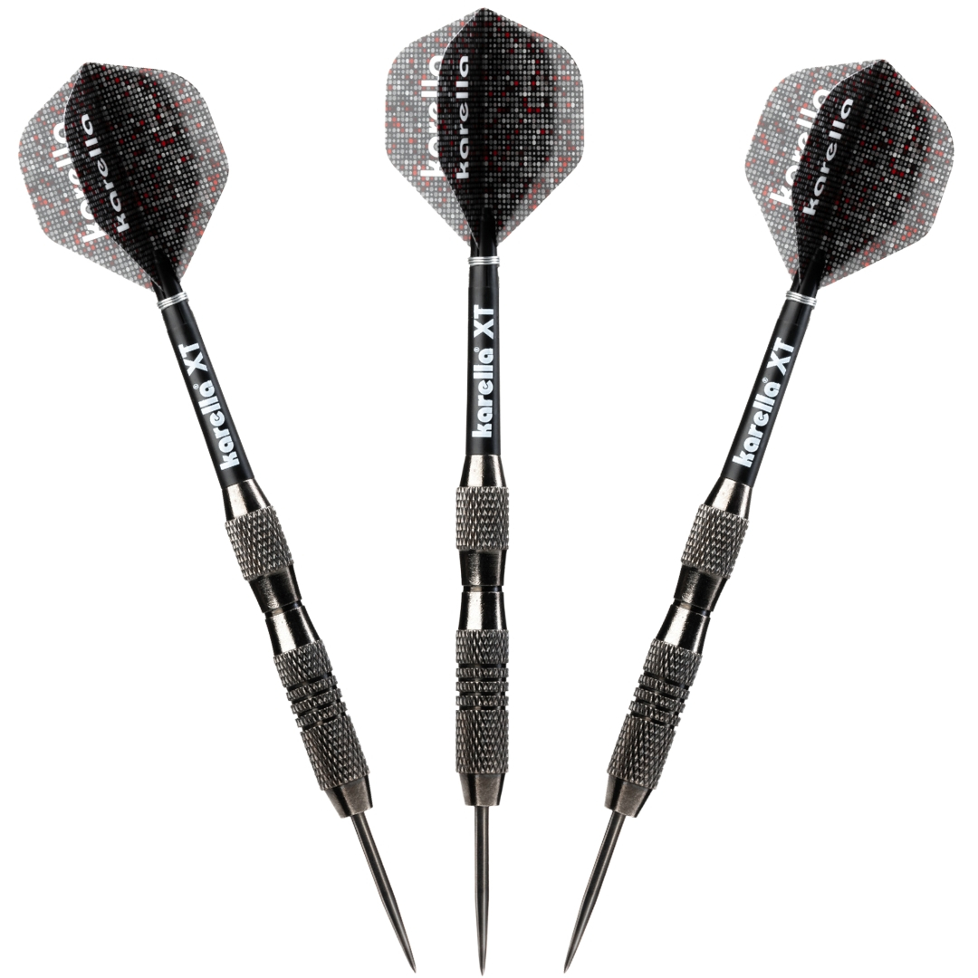 Die Karella XT-Serie als Steel- und Softdart verbindet Design und Qualität bei einem unschlagbaren Preis-Leistungs-Verhältnis. Der Barrel des XT-4 Steel besticht durch seine hochwertige Legierung im Tungsten Look. Dank der Griffmulde im hinteren Bereich des zylinderförmigen Barrels hat der Spieler eine perfekte Orientierung für seine Finger. So werden auch für Hobbyspieler beste Check-outs zur Routine. Der XT-4 Steel ist mit Profi Karella XT-Schäften (Intermediate) und 100 Mic. starken XT-Profi Flights ausgestattet. Verpackt ist das Set in einem schönen Blister inklusive Darthalter. Karella XT Serie – Ideal für Einsteiger und Hobbyspieler.