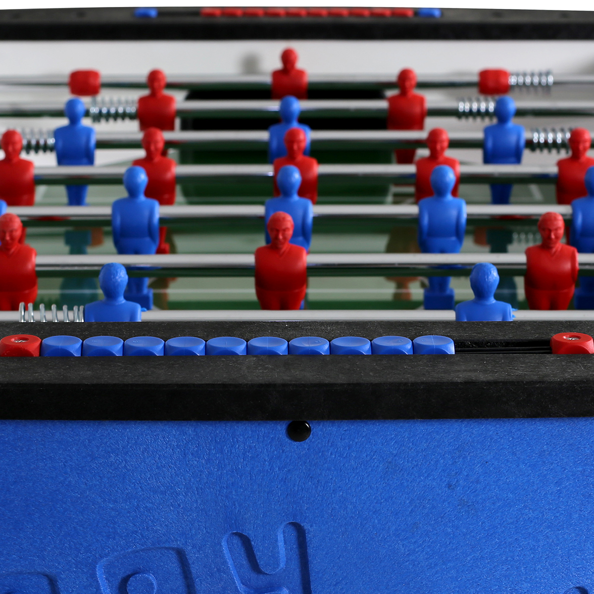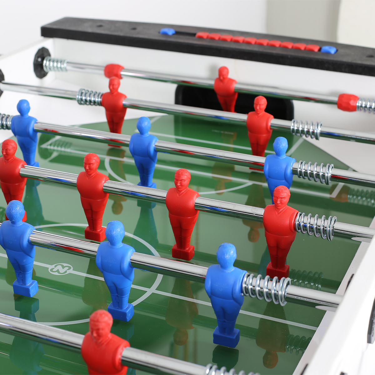 | Spielfeld: | Sandgestrahlte Glasspielfläche mit aufgesetzten Banden |