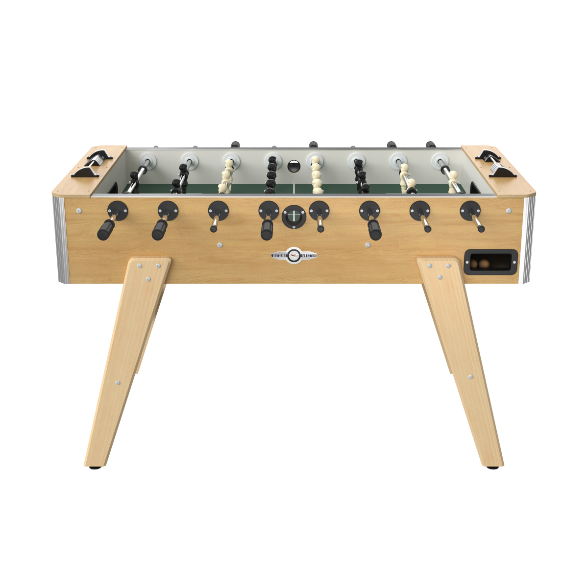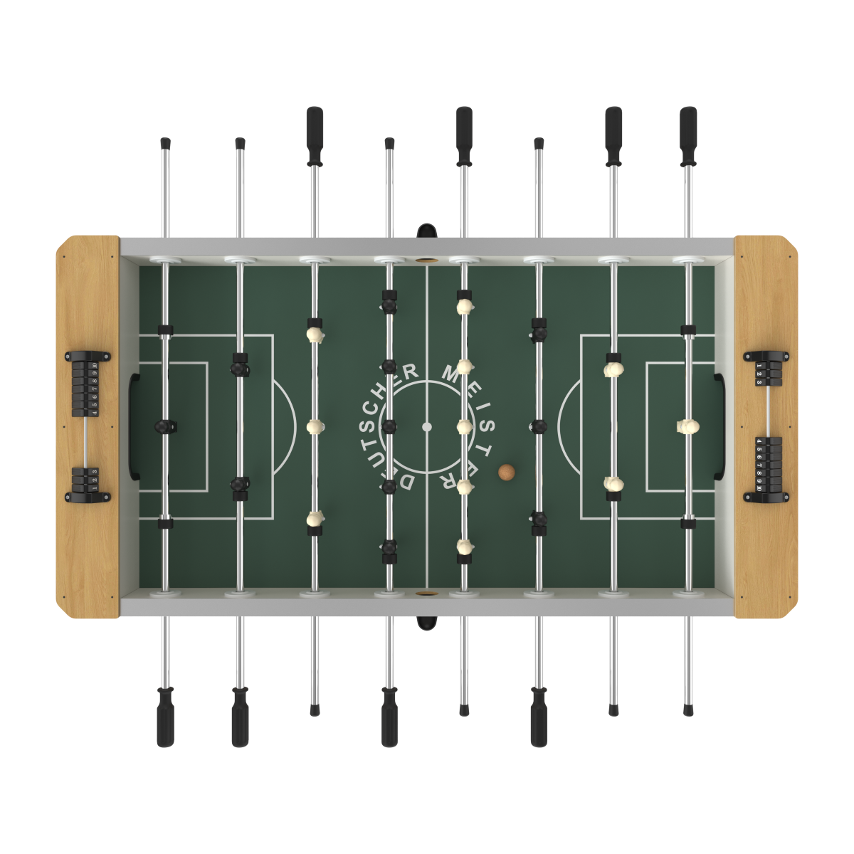 Der Tischkicker Deutscher Meister Profi eignet sich sehr gut zum Heimgebrauch. Der kunststoffbeschichtete Korpus aus einer Holzwerkstoffplatte sowie die massiven, höhenverstellbaren Beine aus Buchenholz bieten die nötige Stabilität. Die Turnierfiguren sind einzel auf die 16mm verchromten Stahlrohrstangen geschraubt. Diese laufen durch doppelläufige Kugellager. Umlaufende Schutzkanten und -ecken bieten zusätzliche Sicherheit für Kinder. Der Deutsche Meister Profi ist in den Dekoren schwarz, rot, gelb, silber sowie Eiche erhältlich.
