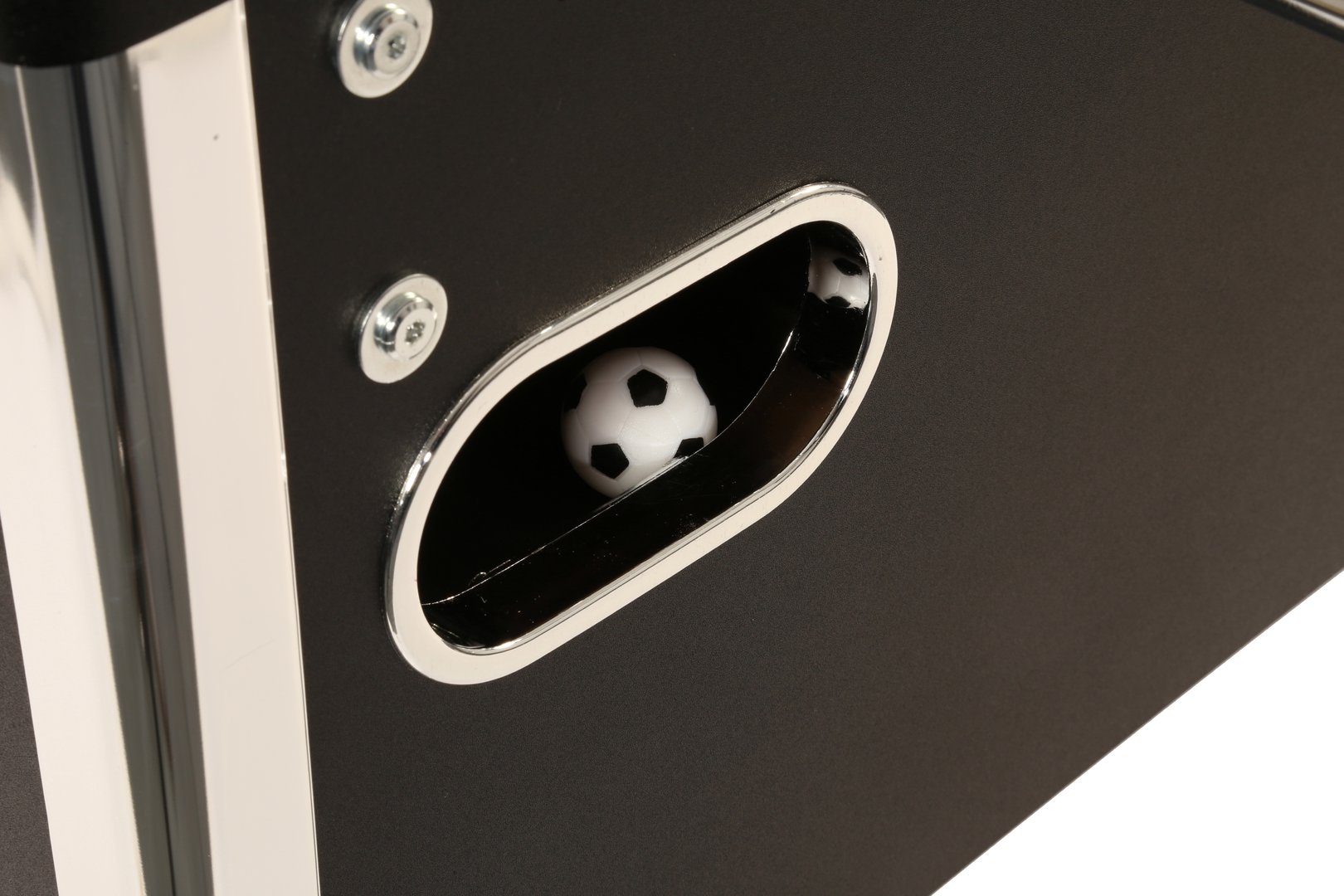 Der „Deluxe-Kicker“ verfügt über 16 mm starke, verchromte Massivstahlstangen, die in hochwertigen Kugellagern verschleißarm geführt werden. Die besondere Stabilität erhält der Kicker durch die extra großen ca. 12,5 x 12,5 cm starken Holzfüße, die mit einer zusätzlichen Chromstange verstärkt werden. Zur perfekten Justierung ist der Kicker sogar mit höhenverstellbaren verchromten Stellfüßen ausgestattet. Die Kickerfiguren sind aus robustem PVC und können bei Bedarf ganz einfach einzeln ausgetauscht werden. Die ca. 14 mm starke Spielplatte ist mit hochgezogenen Spielfeldecken ausgestattet.