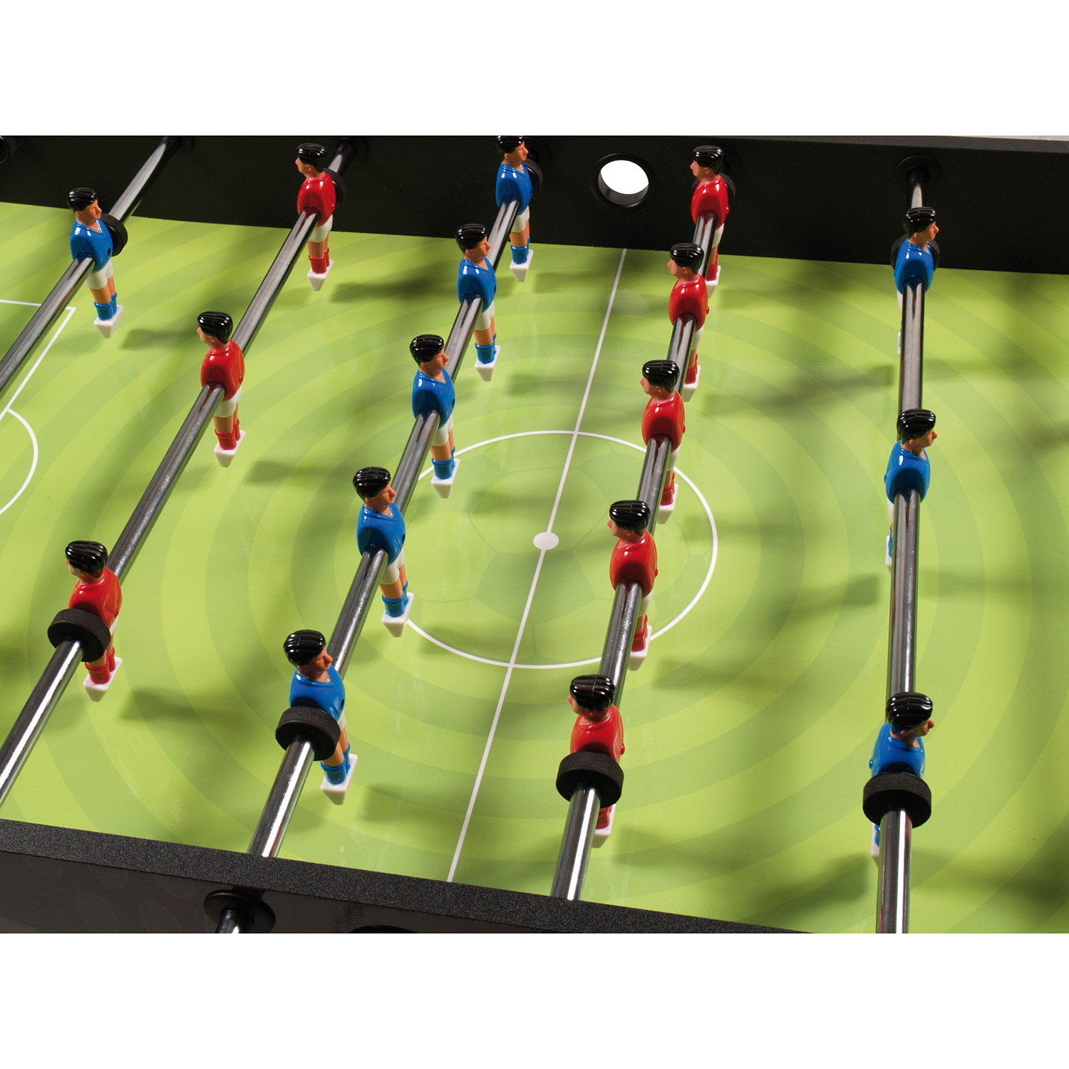 Der Tischkicker Winner eignet sich perfekt fürs Kinder die Spaß am Tischfußball-Spiel haben. Um dem Geschmack des Nachwuchses gerecht zu werden kommt der Tisch in einem schlichten Schwarz kombiniert mit angesagtem Druck auf dem Korpus. Damit der Spielspaß möglichst schnell beginnen kann sind 4 schwarz-weiße Bälle im Lieferumfang enthalten. Des Weiteren ist der Tisch mit manuellen Torzählern und Ballausgaben hinter den Toren sowie Ball-Einwurfschalen auf Höhe der Mittellinie des Spielfelds ausgestattet. Die Spielfiguren sind aufgeteilt in 2 Teams, die durch die Farben Rot und Blau kenntlich gemacht werden.