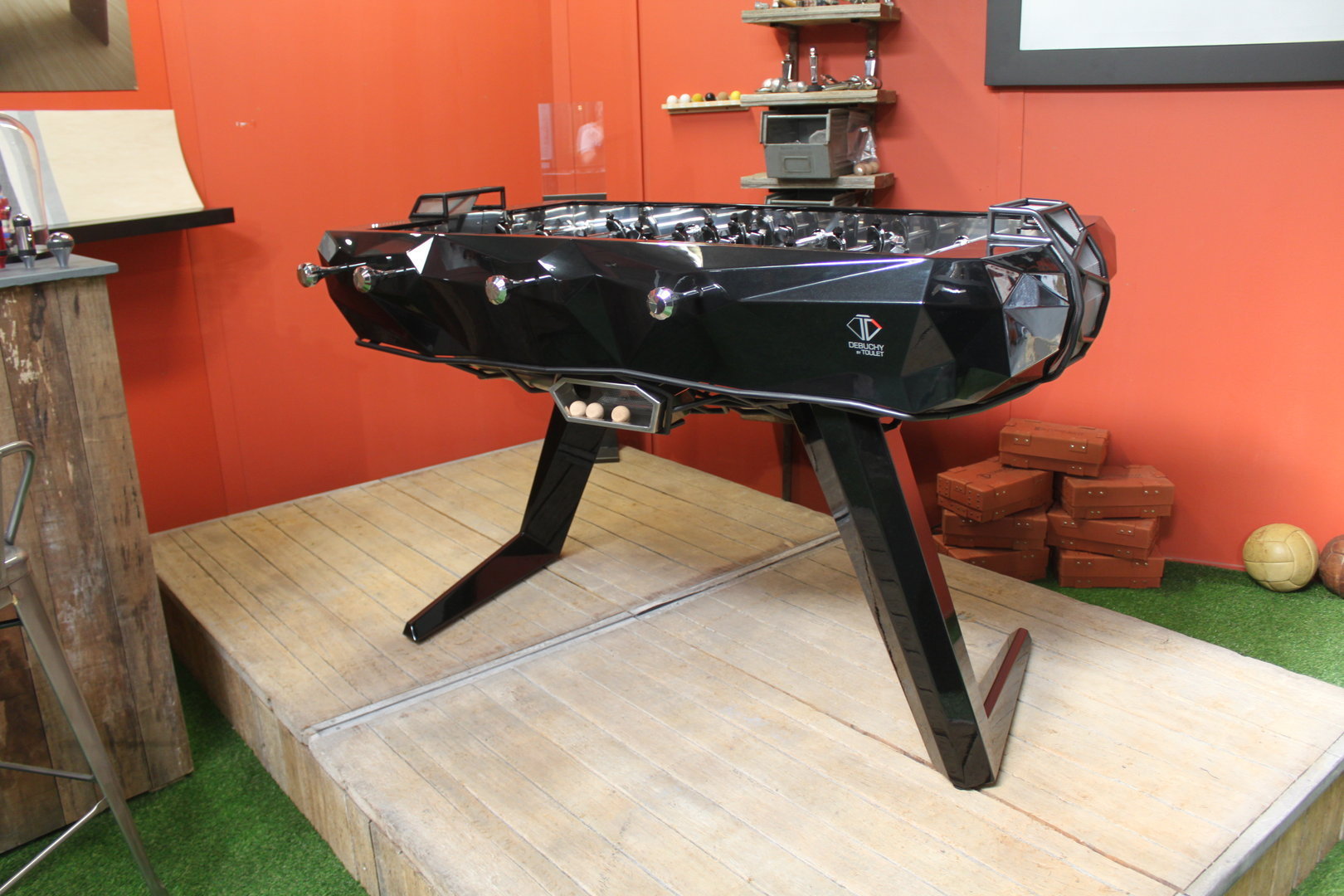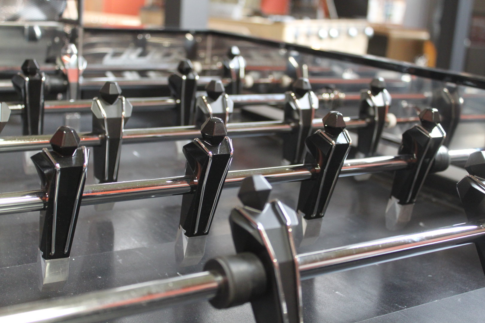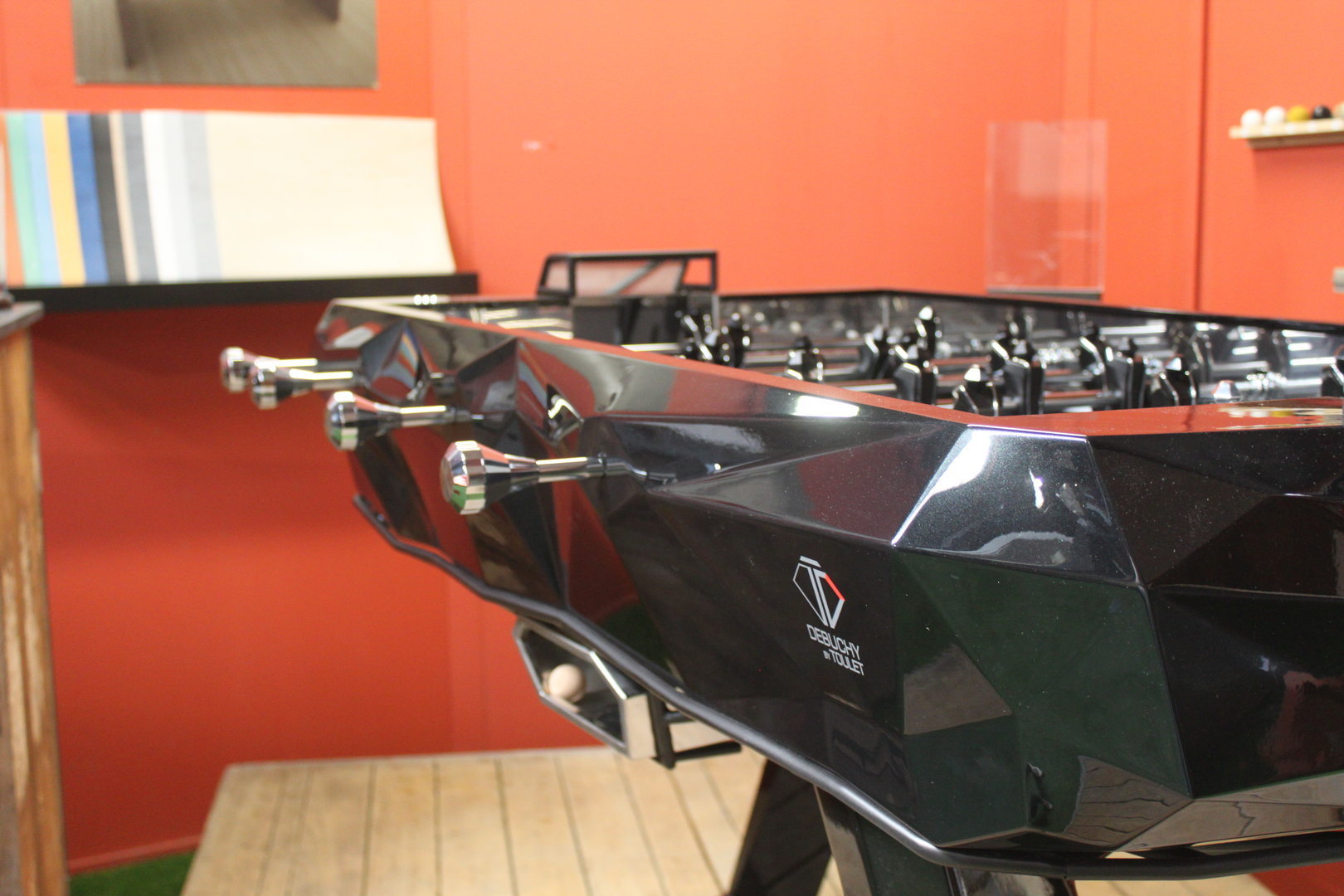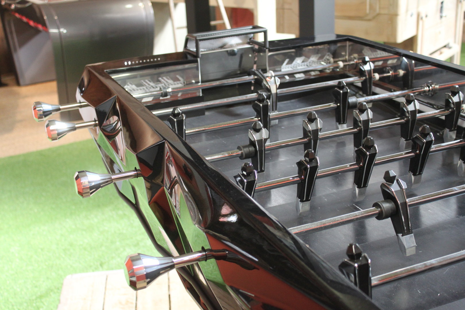 Das Design des Le Sian Tischkickers von Toulet ist inspiriert vom Design moderner Sportwagen. Der hochwertige Metallkorpus sowie die Metallbeine bieten die nötige Standfestigkeit und Robustheit. Die Konstruktion ist bemalt und 100% rostfrei. Ein zentraler Ballauswurf ist in den Korpus eingearbeitet, welcher zusätzlich mit Gerflex beschichtet wurde. Die Aluminiumfiguren verfügen über abnehmbare Füße, was das Feature "Rote Karte" ermöglicht. Hierbei können einzelne Spieler aus dem Spiel genommen werden, was zusätzlichen Spielspaß bietet und die Partie zusätzlich anheizt. Die Stangen sind verchromt und zusätzlich mit Teflon angereichert, was perfekt Laufeigenschaften ermöglicht. Am Ende der Kickerstangen sind die Griffe in Diamantenform angebracht, welche natürlich auch verchromt wurden. Weiterhin verfügt der Le Sian Designkicker über folgende Features: LED-Torzähler, Start- und Stoppknopf sowie eine LED-Spielfeldbeleuchtung.