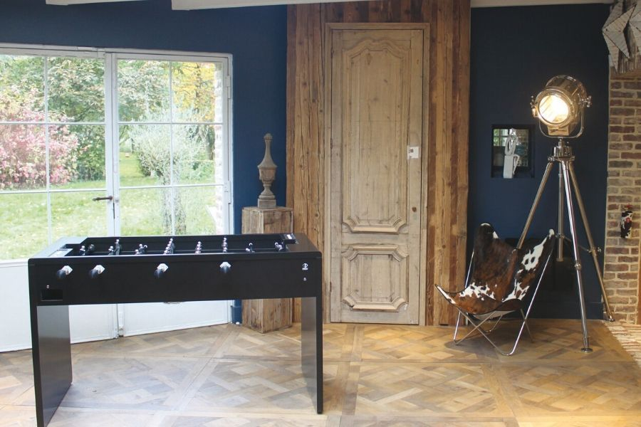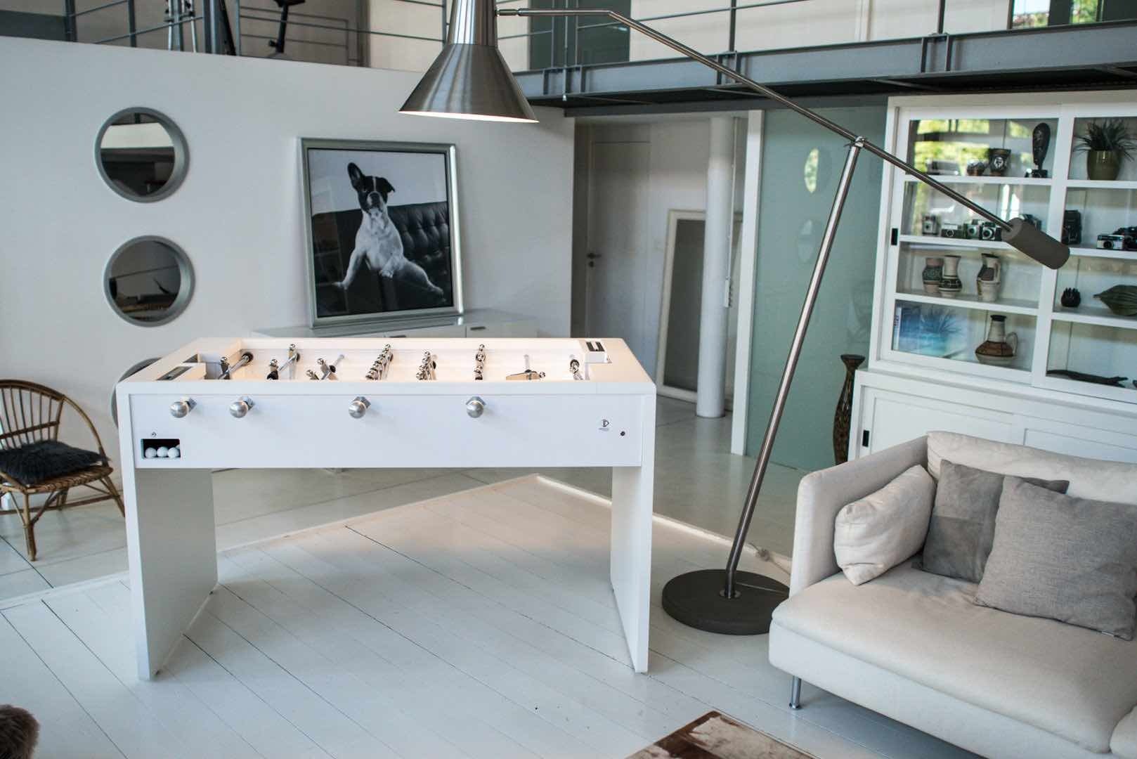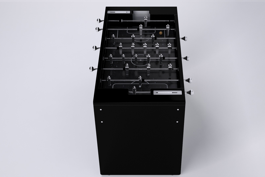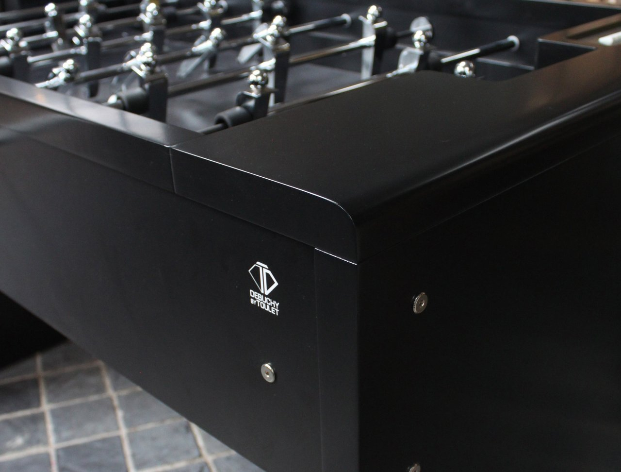 Der individualisierte T11 Tischkicker von Toulet gehört zur Luxury -Line. Er verfügt über 45mm Wandstärke und einem Korpus aus Holz. Die verchromten 15mm Teleskopstangen werden mit runden oder länglichen Griffen bestückt. Auf den Stangen sind die verchromten Aluminiumspieler angebracht. Die besondere Konstruktion der Spieler ermöglicht "schießen" mit dem Kopf der Figur. Weiterhin verfügt der T11 über verchromte und stahlgebürstete Aluminiumtorrahmen. Der Korpus ist mit Gerflex beschichtet. Der T11 ist mit zwei Ballausgaben unter den Torkästen ausgestattet, sodass der Ball einfach entnommen werden kann.