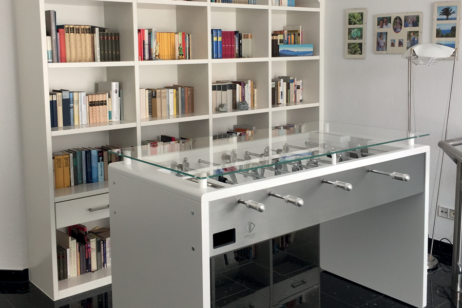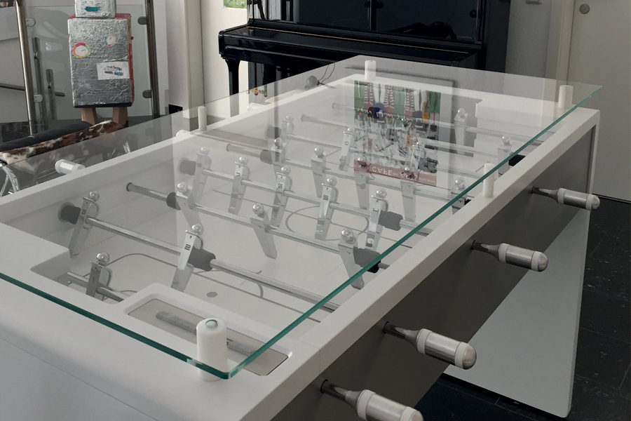 -Extras: Spielfeldlinien (Aufpreis 60,00€), Glasabdeckplatte abnehmbar oder fest (Aufpreis 1.190,00€), runde oder lange Griffe