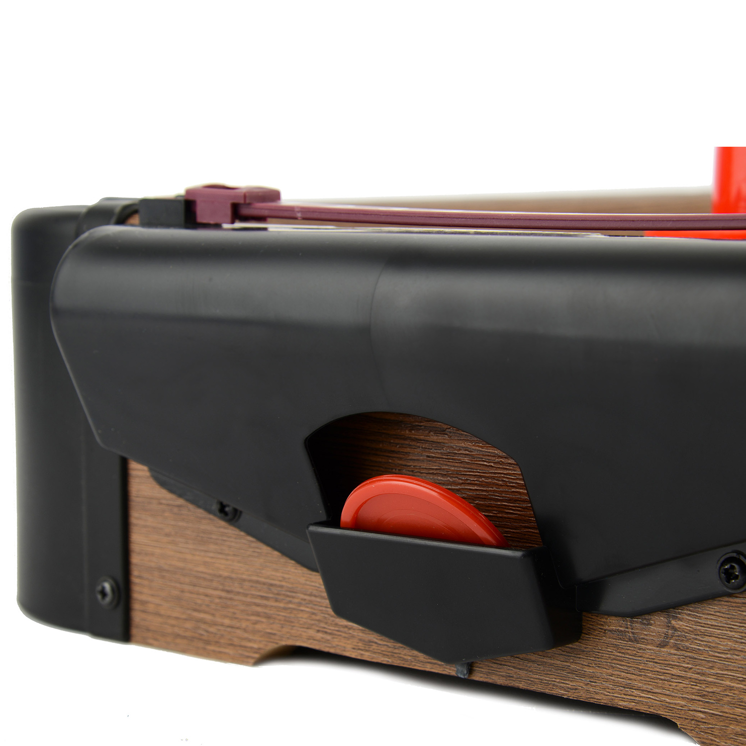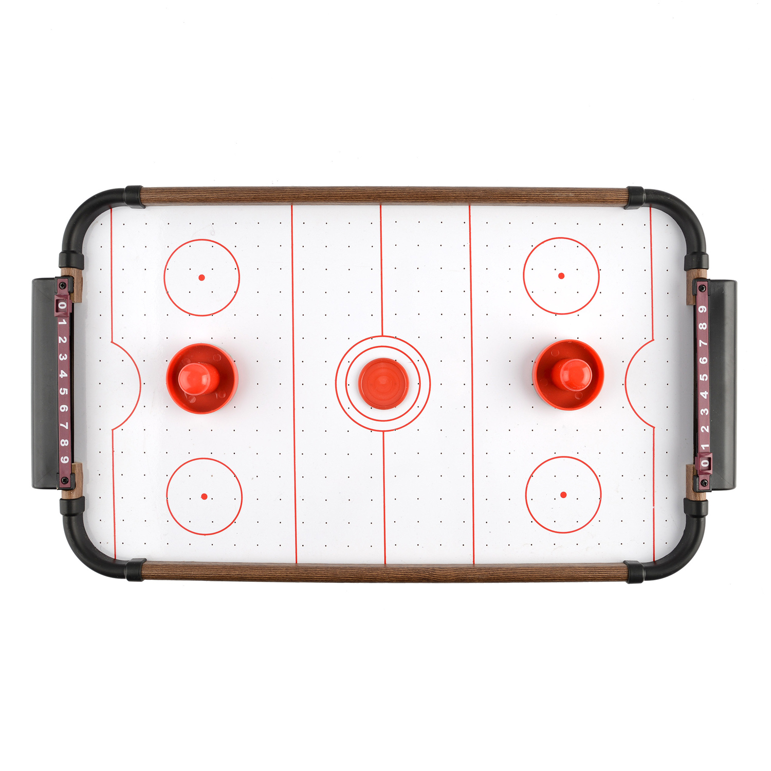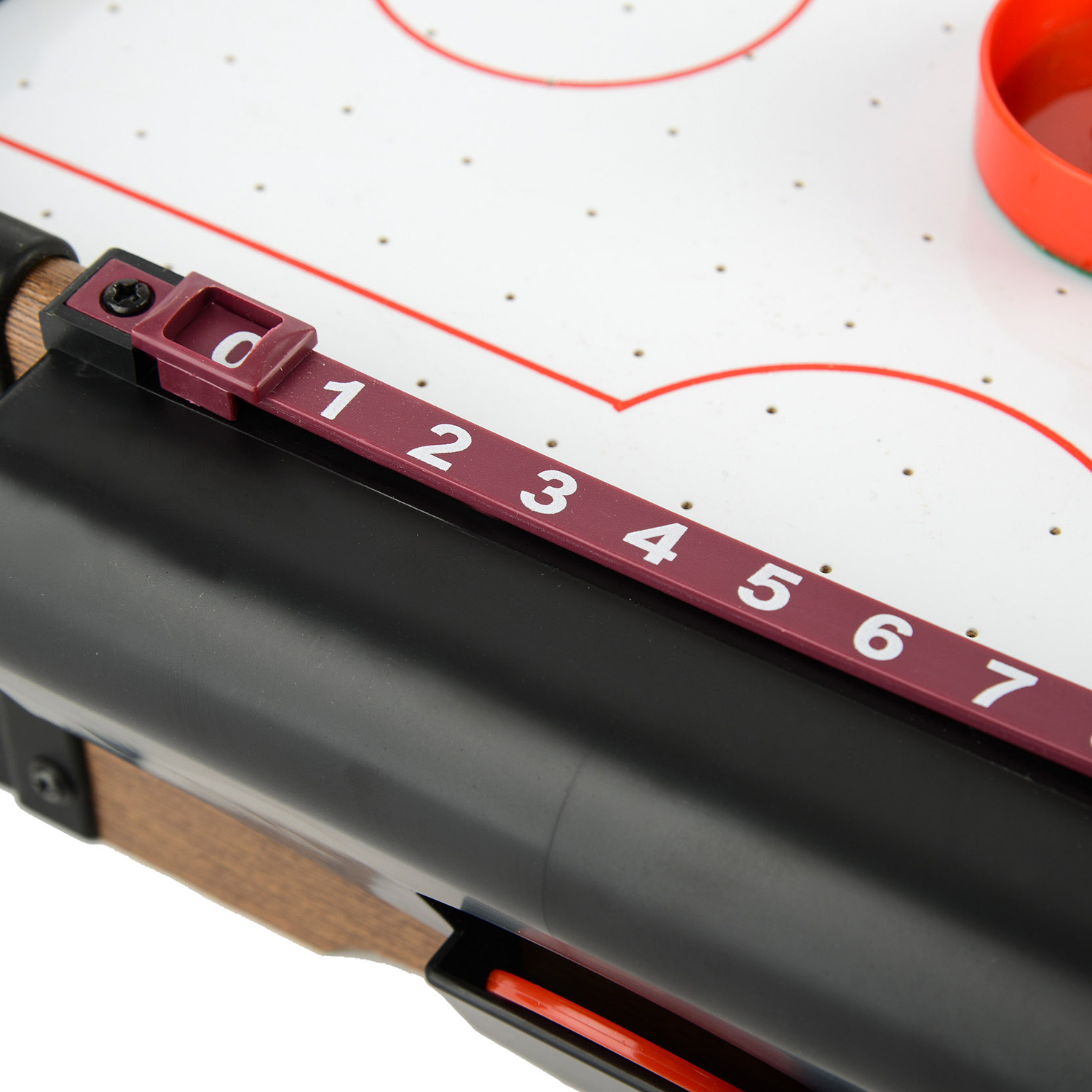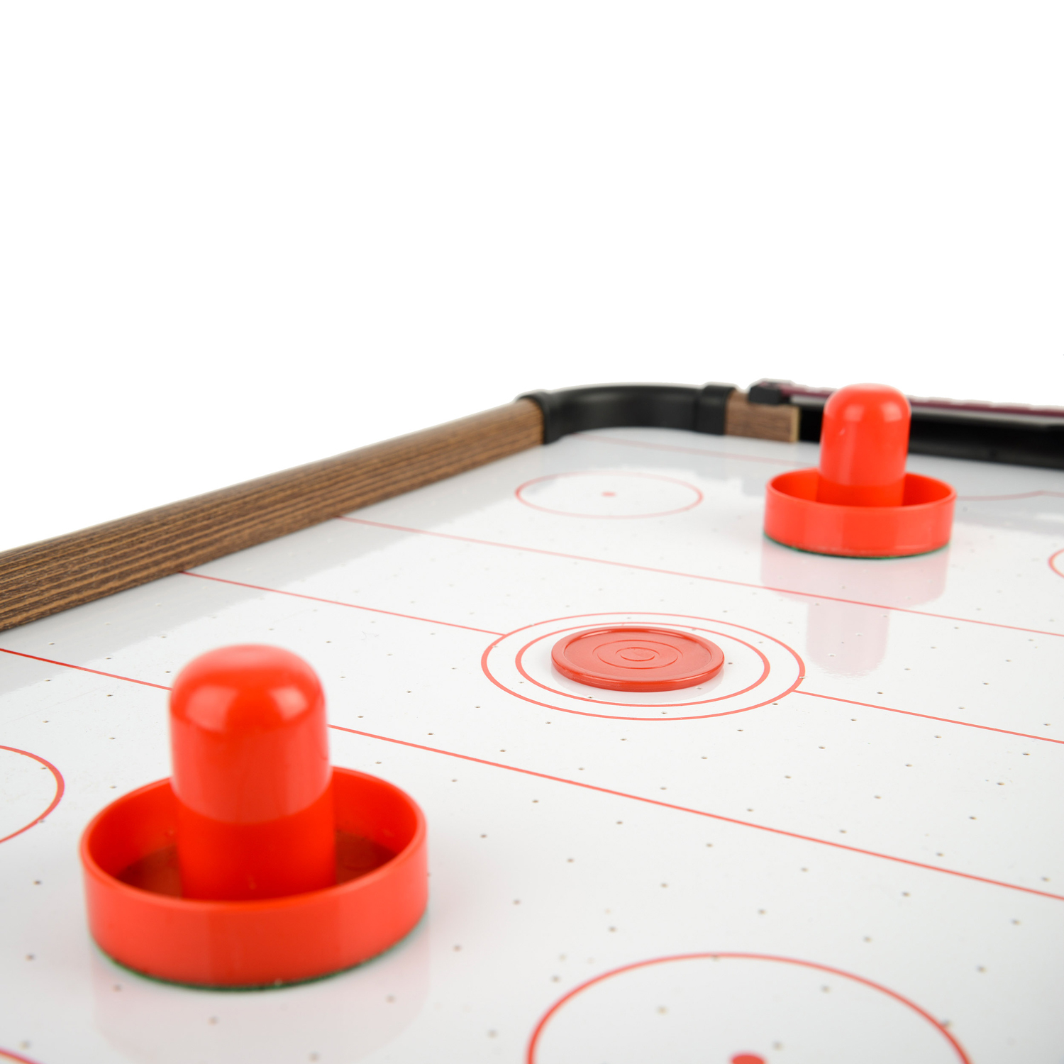 Der Power Play Mini Airhockey ist sehr schnell aufgebaut und spielbereit. Neben dem Heimgebrauch ist er somit auch perfekt für Reisen oder Familienausflüge in den Park geeignet. Das Spiel ist für Kinder ab 5 Jahren, doch auch Erwachsene finden Spaß an der kleinen Airhockey-Tischauflage. Der Power Play Mini Airhockey ist durch sein geringes Gewicht von 2 kg und seinen Abmaßen sehr handlich und ein nettes Geschenk für Groß und Klein. Optisch übzeugt er durch edle Holzoptik gepaart mit schwarzen Kunsstoff-Teilen. Hinter den Toren befinden sich manuelle Torzähler, wodurch die Spieler stets den Überblick über den aktuellen Spielstand behalten. Die Auflage wird mit Hilfe von 8 AA-Batterien betrieben, die im Lieferumfang nicht enthalten sind. Enthalten sind jedoch 2 Schläger sowie 1 Puck.