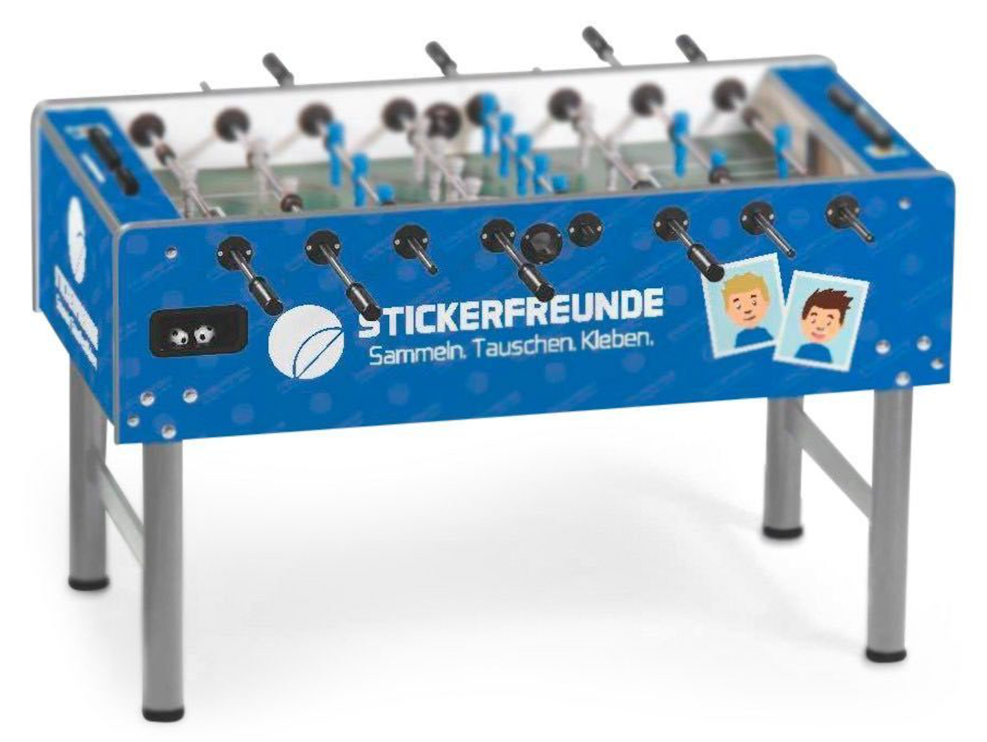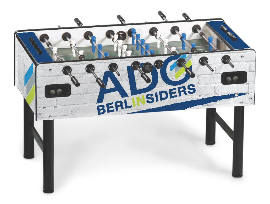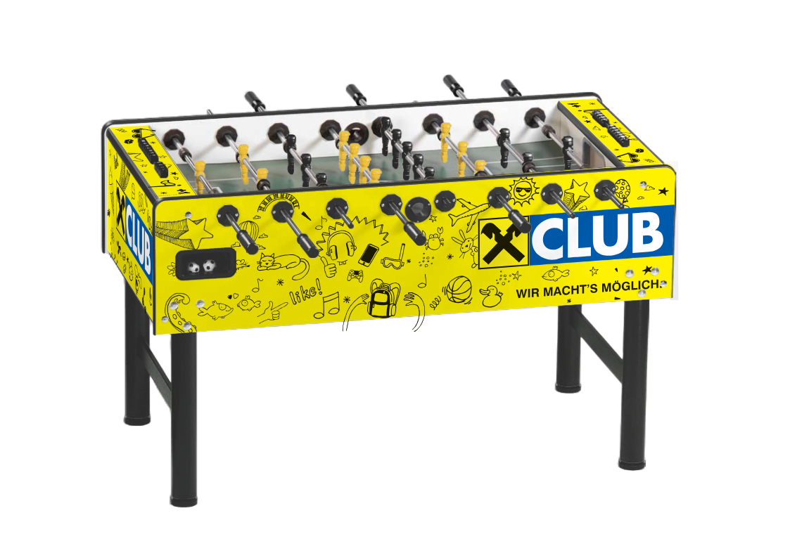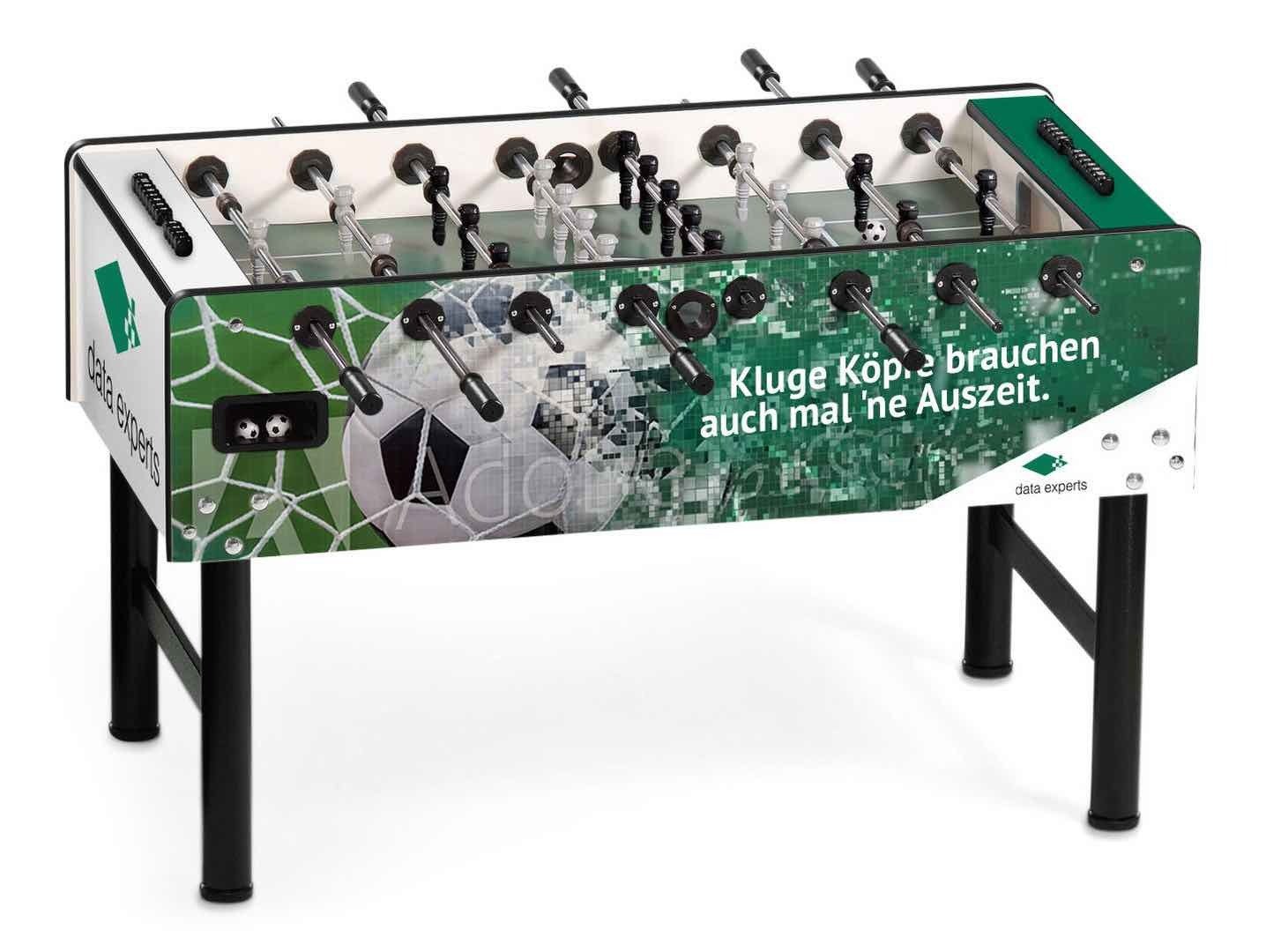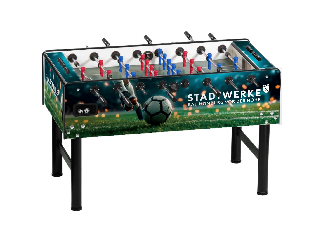 Individualisieren Sie Ihren Kickertisch! Mit dem hochwertigen Branding auf Ihrem Vector Tischkicker. Gestalten Sie die Seiten-, Längs- und Oberfläche Ihres Kickers frei in 4c und schaffen Sie sich somit ein einzigartiges Möbelstück.