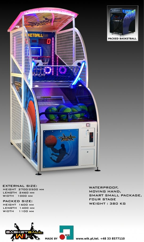 Dieser Basketballautomat von WIK passt perfekt in Spielhallen. Der stabile Korpus aus Metall und Polykarbonat steht unverschiebbar fest. Gepaart mit dem hohen Gewicht von 380 kg hällt der Automat auch härtesten Belastungen stand. Je nach Spielstufe fänge der Korb an sich seitwärts zu bewegen. Treffer bringen je nach Spiellevel mehr Punkte. Diese können auf der LED-Anzeige nachvollzogen werden. Diese zeigt außerdem den zu schlagenden Highscore sowie die Spielzeit an. Weiterhin ist der WIK Basketballautomat mit einem Münzprüfer ausgestattet. Bunte LED-Leuchten sowie Soundeffekte machen das Spielgeschehen interessant. 5 Bälle sind im Lieferumfang enthalten.