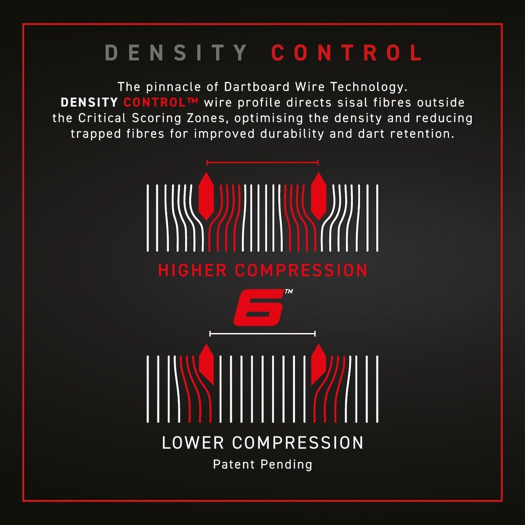 Die neuentwickelte 6. Generation der Winmau Dartboards findet mit dem Blade 6 seinen Höhepunkt. Sie ist sowohl nach den Vorgaben der British-Dart-Organisation als auch der World Dart Federation gefertigt. Die Dartscheibe ist mit Density Control™-Draht verdrahtet, der für eine optimale Faserdichte und einen besseren Halt der Darts in den Bull, Tripple und Double Feldern sorgt. Dieser neue ultradünne Draht liegt im 60° Winkel, damit die Darts in den Trefferbereich gelenkt werden und weniger Bouncer passieren. Das Bullseye, sowie das Outerbull haben ein 25% dünneren Draht im Vergleich zum Vergänger, dem Blade 5 Dartboard.