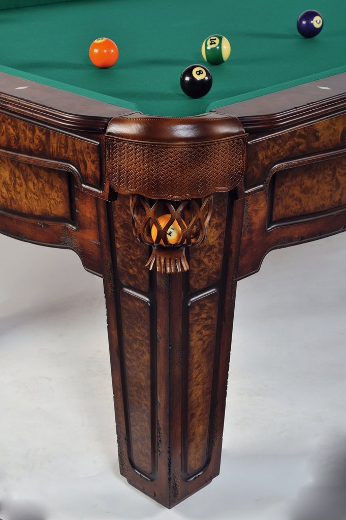 Kein anderer Billardtisch ist mit einer solchen Liebe zum Detail und so viel Handarbeit Stück für Stück sorgsam produziert worden. Jedes Teil des Wellington wird aus Massivholzblöcken perfekt herausgearbeitet und mühevoll in aufwendiger Oberflächenbearbeitung mit dem einzigartigen Antik-Look versehen. Sein verzugsfreier Massivholzunterbau sowie die 3-teilige, 25 mm starke Naturschieferplatte garantieren 100% Stabilität. Ein zusätzlicher Vorteil sind die dezenten Stellfüße unter den mit dekorativen Ornamenten versehenen Holzbeinen.
