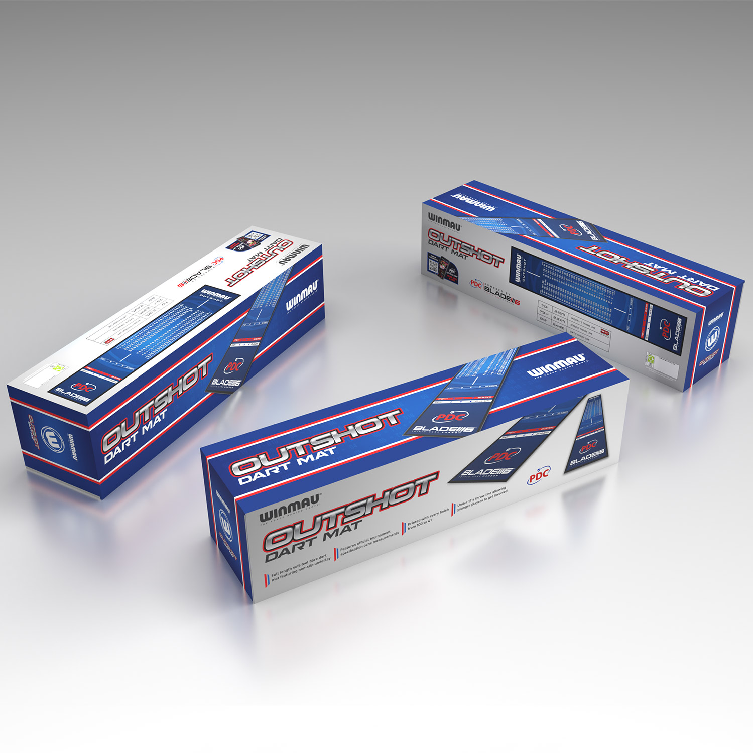 Hervorragende Winmau Outshot Dartmatte aus weichem Material in einem stilvollen, modernen Design mit rutschfester PVC-Unterlage und -Rändern. Diese Winmau Dartmatte ist mit den offiziellen Turnierspezifikationen der Längen bedruckt, wodurch die Matte sowohl für den Wettkampf als auch für den Heimgebrauch geeignet ist. Die Winmau Outshot Dartmatte ist leicht, einfach aufzurollen und zu reinigen.