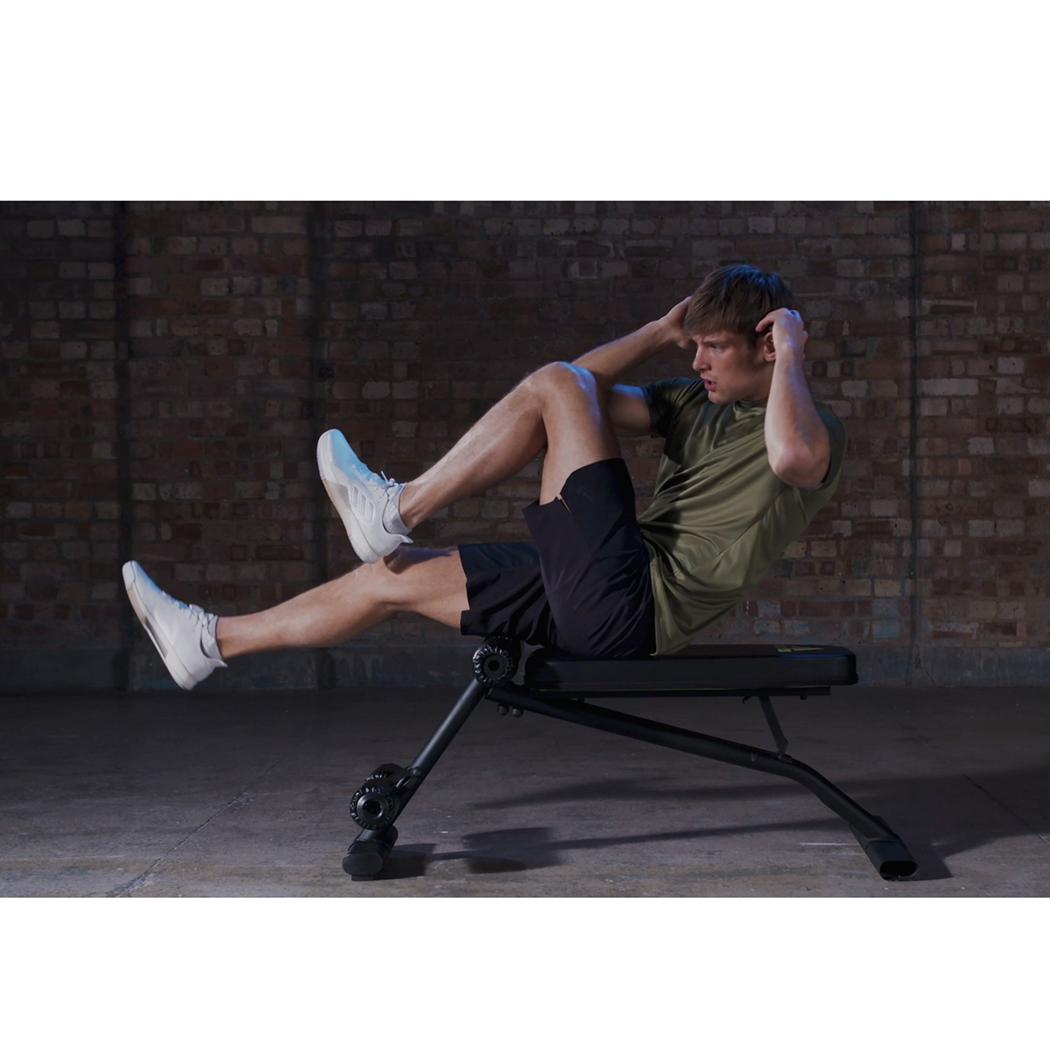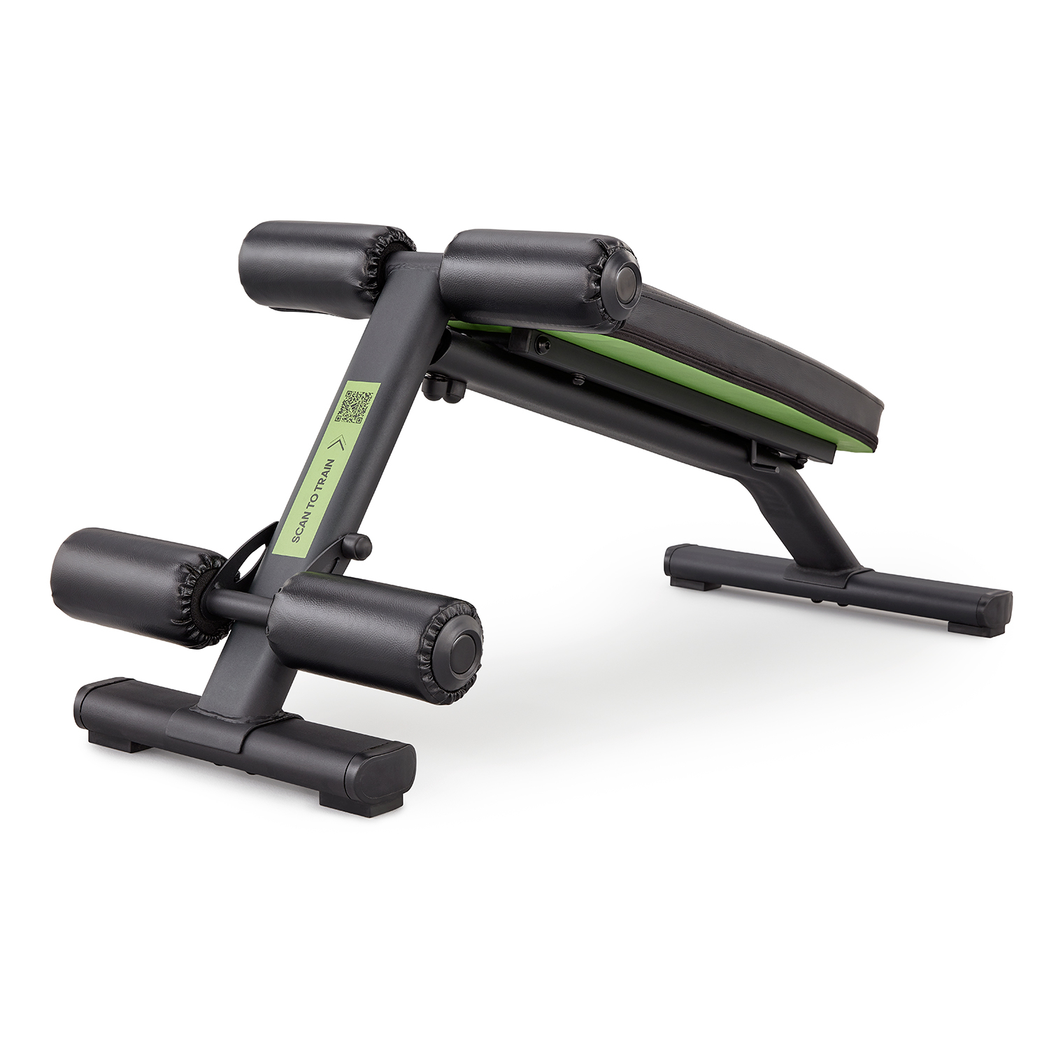Ab BenchWith Scan to TrainSturdy steel frameWide base for total stabilityTapered back cushionComfortable 2.5 inch thick paddingFoam-covered knee and ankle supportsSizes: Width 46 cm x Length 113.5 cm x Height 47 cmBank weight: 11.5 kgMaximum user weight 125 kg