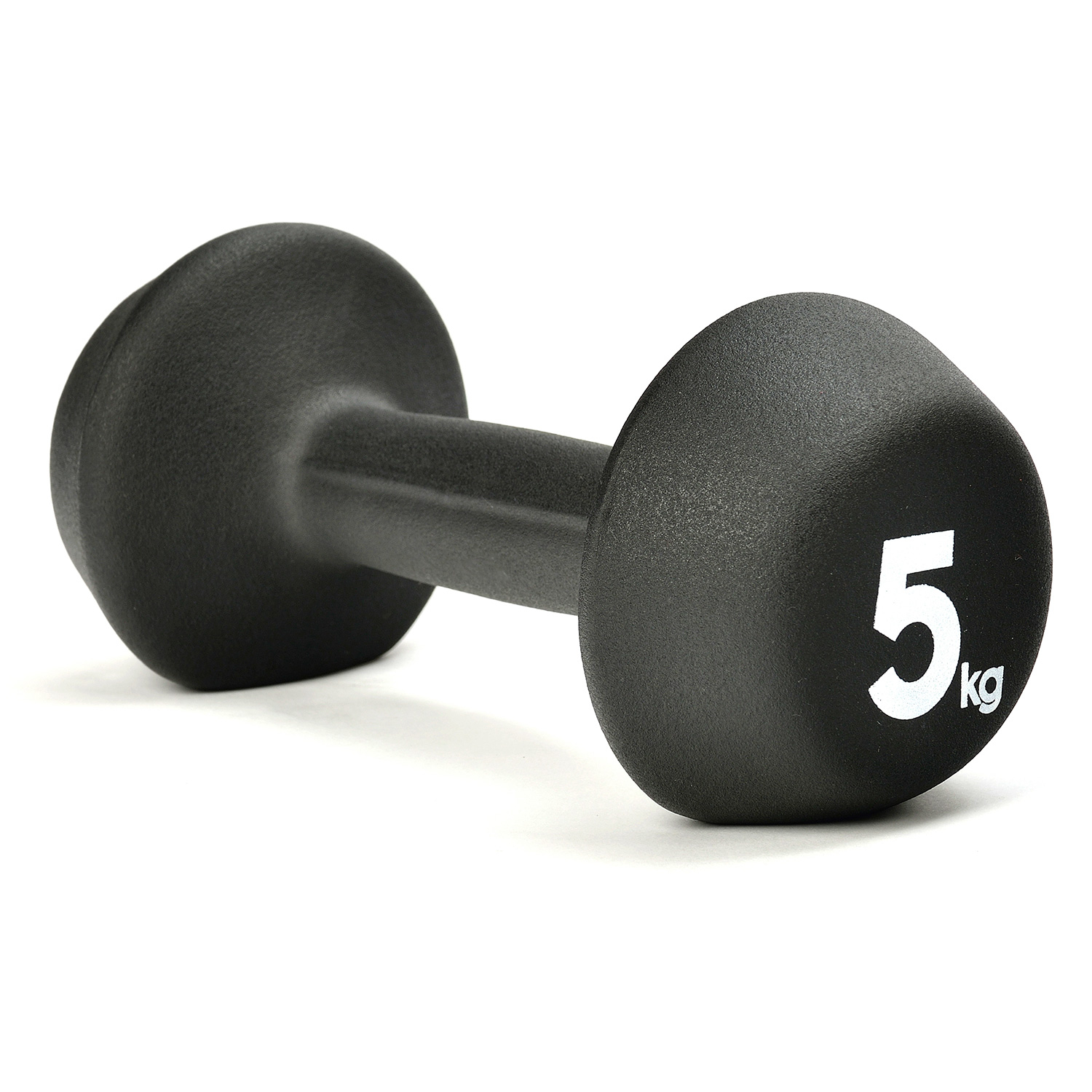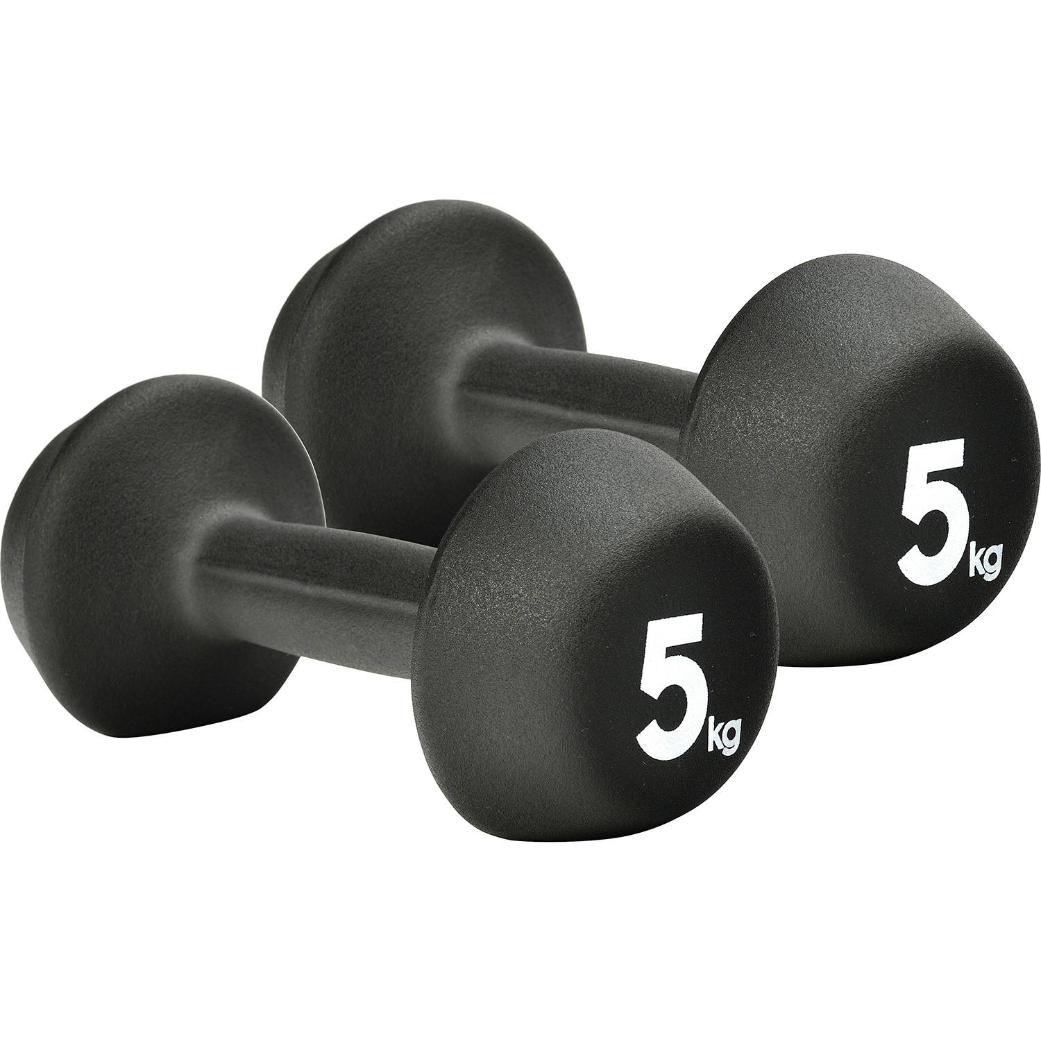Set of two dumbbellsWeight: 2 x 5 kgShape prevents rolling awayNeoprene coating for increased gripDimensions: 24 x 11.2 x 10.1 cm