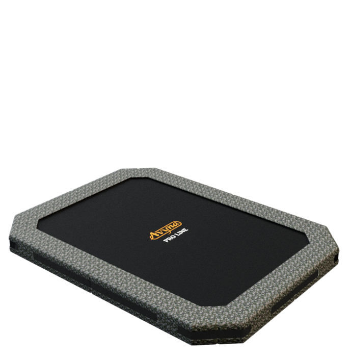 Rectangular InGround trampolineThis rectangular InGround trampoline from Pro-Line is a popular model because of its size, 305 x 225 x 20 cm. Avyna gives a lifetime guarantee on the frame of the trampoline and 10 years on the springs. In other words, with an Avyna trampoline you have quality in your garden.For the edge you can choose from the colours green, grey or camouflage. The Avyna Pro-Line trampoline surround completely covers the frame and the double galvanised springs and remains neatly on the trampoline during every jump.This trampoline is also available with safety net.Preferring a trampoline which is completely buried? Then look at the rectangular Flat-Levels. These trampolines do not rise above ground level. Difference between the Avyna Pro-Line trampoline set 23 and 223Where the tubes of the frame of the 23 are "round", the tubes of the 223 are "square". The Avyna Pro-Line 223 is also suitable for public areas.
