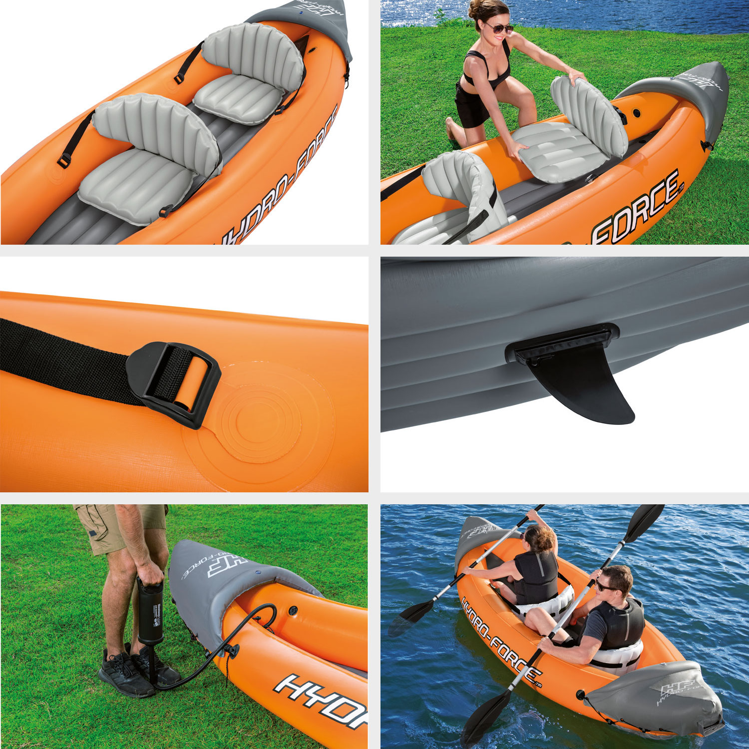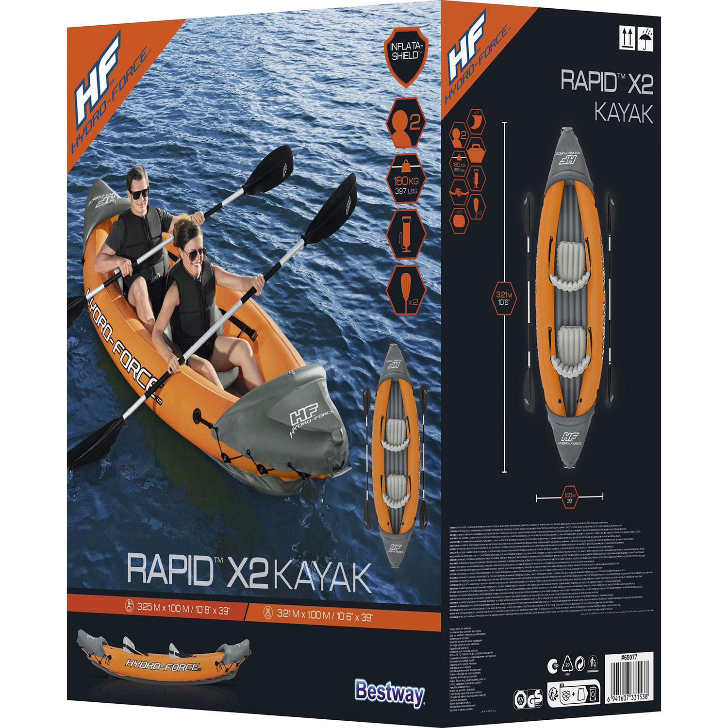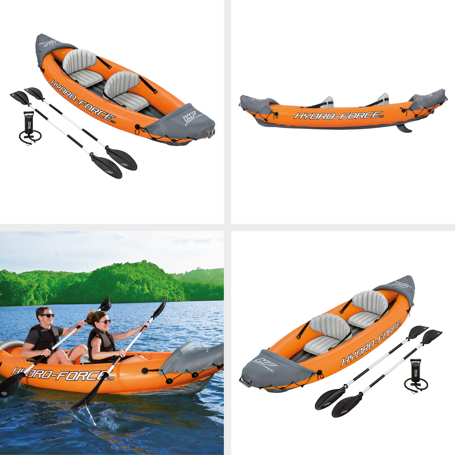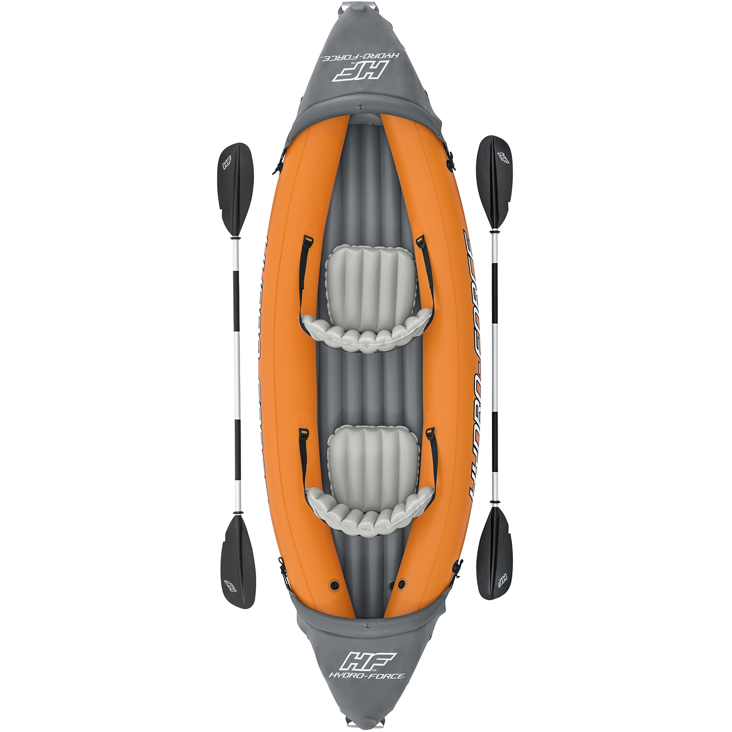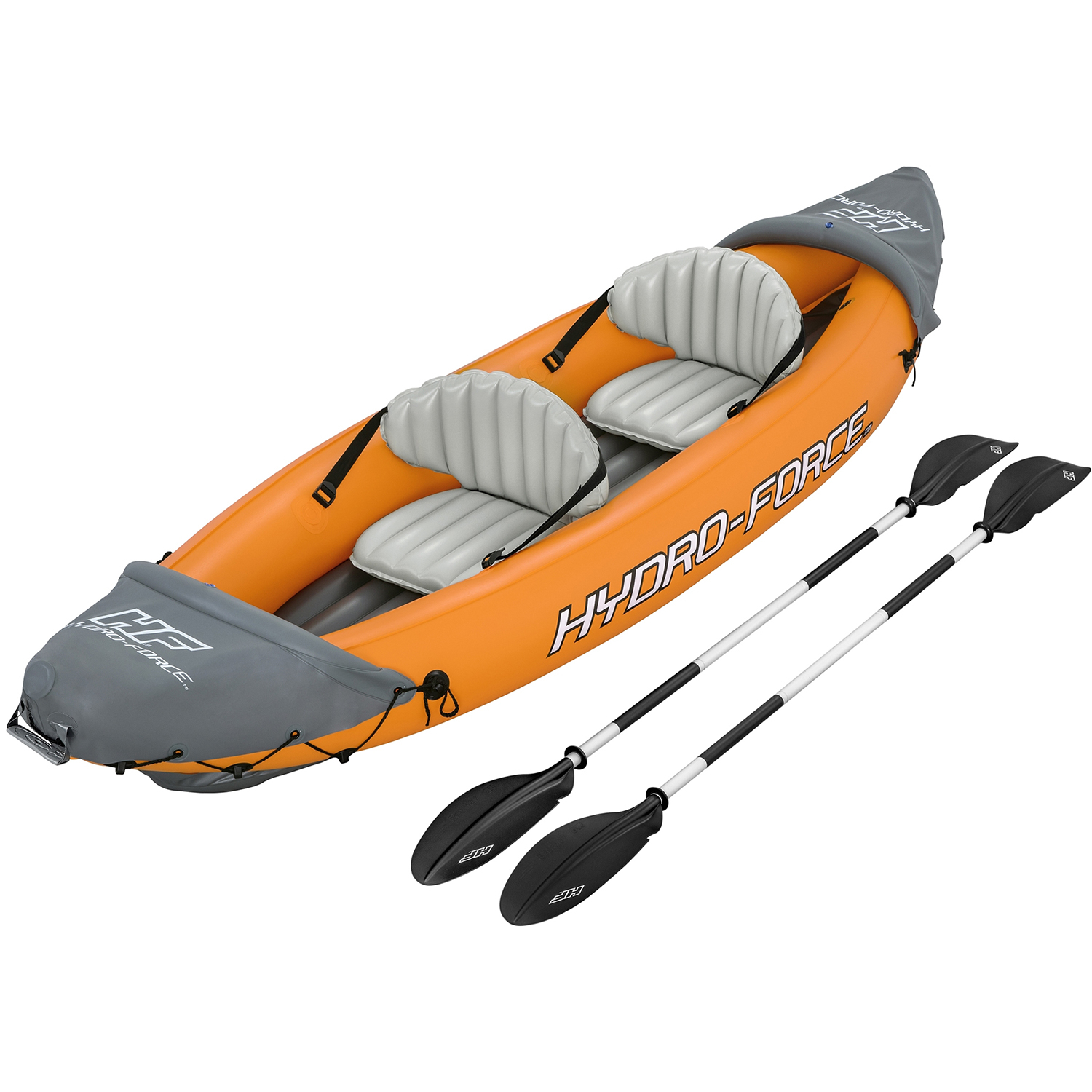 2-Person inflatable kayakHydro force Lite-rapid X2Size: 321 x 88 x 44 cmWeight of kayak: 9 kgDurable PVCInflatable adjustable seatsFront and rear paddlesRemovable finIncludes hand pumpIncludes 2 paddles