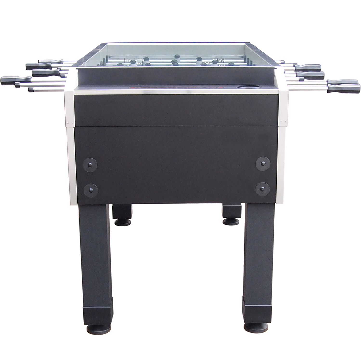 The solid Buffalo coin operated foosball table suits perfect for bars and pubs. On the top of the table is a glass cover to prevent hopping out of the ball. In addition to the lost of the ball, the glass thwarts people to manipulate the table. The ball entry is designed with a guide on the outside of the carcass. To have a continous game the table is equipped with pulled-up playfield corners to prevent the ball from lying static in the corner. Attuned to the red and blue figures, there are score counters in the respective colors behind the goal. Owing to its extras and appealing design the table suits perfect to nearly every public place or shop. In addititon to the standard variety, it is also available in black with counting units and cupholders embedded in the carcass. The table is equipped with a mechanic coin shute for 50 Cent coins. As a variety of the table, a model without coin shute can be ordered. As well as the 50 Cent variety a 1 € coin shute is available. Next to the coin shutes for Euro coins, a shute for tokens and 50 tokens can be ordered.