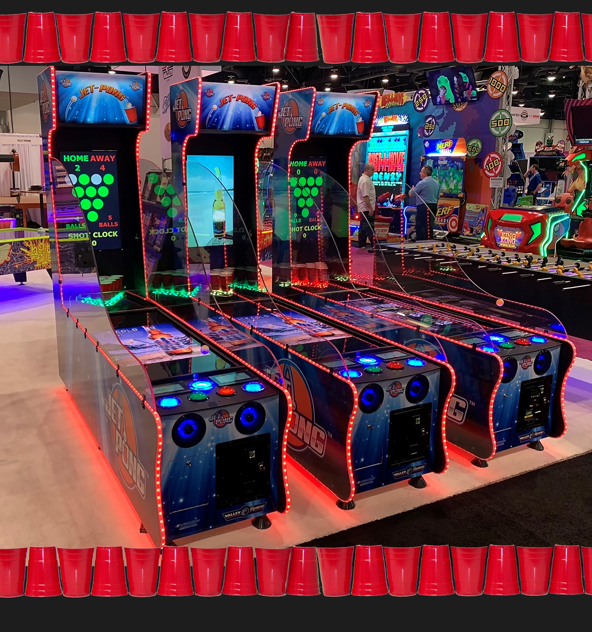 Dieses innovative Tischspiel kann mit 1 oder 2 Spielern gespielt werden und verfügt über unsere patentierte Aerr-Technologie zur Ballrückgabe. Das Spiel verfügt außerdem über HMI-Zählbildschirme, Videowerbebildschirme, benutzerdefinierte LED-Beleuchtung, ein Matrix-LED-Spielfeld, ein 200-Watt-Lautsprechersystem, benutzerdefinierte Geräusche für die Zähl- und Attraktionsmodi, integrierte drahtlose Übertragung und erfüllt die örtlichen, städtischen und staatlichen Richtlinien für Schanklizenzen, so dass es in Bars, Restaurants, Resorts, Bowlingcentren und Universitäten eingesetzt werden kann. Jet-Pong erfordert keine Flüssigkeiten jeglicher Art, sodass dieses Spiel ohne Unordnung funktioniert und einer der Top-Geldverdiener (ROI) in jeder Einrichtung ist.
