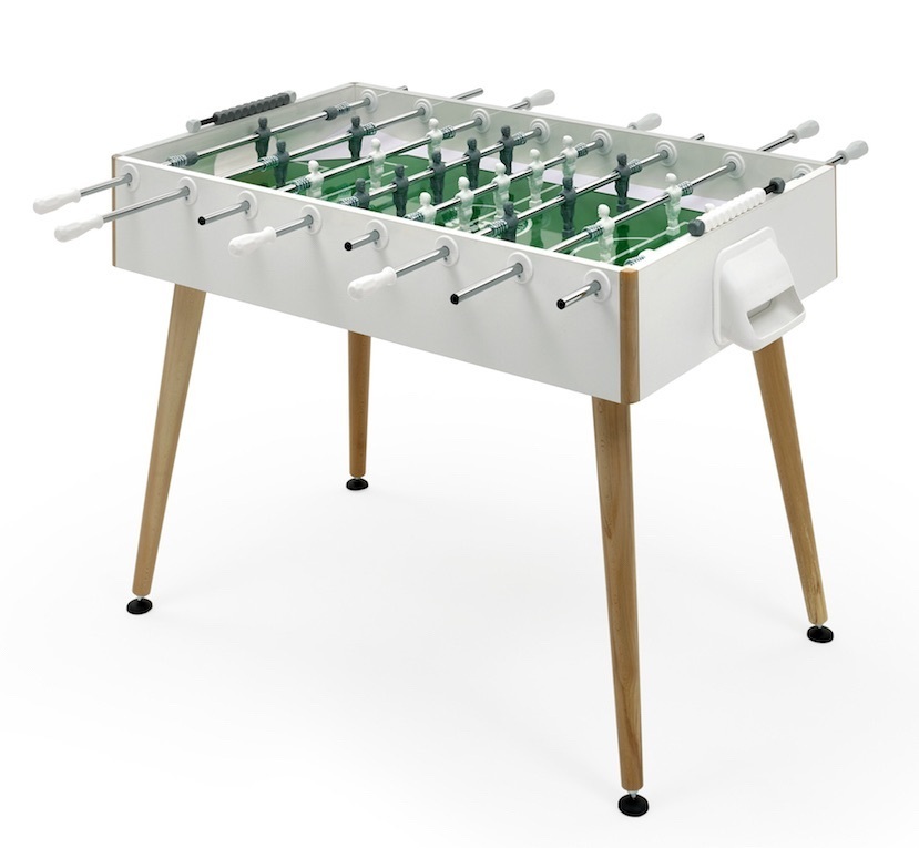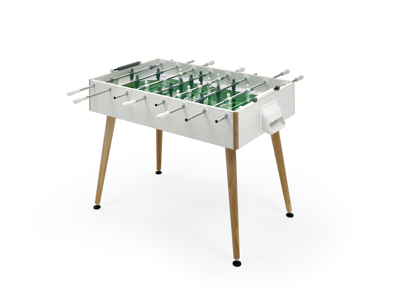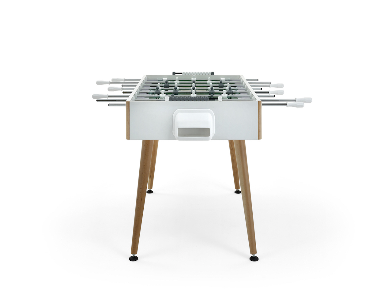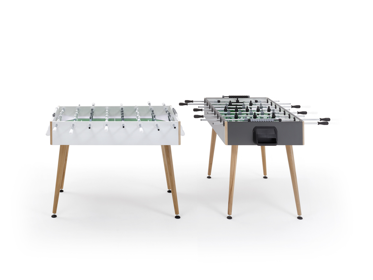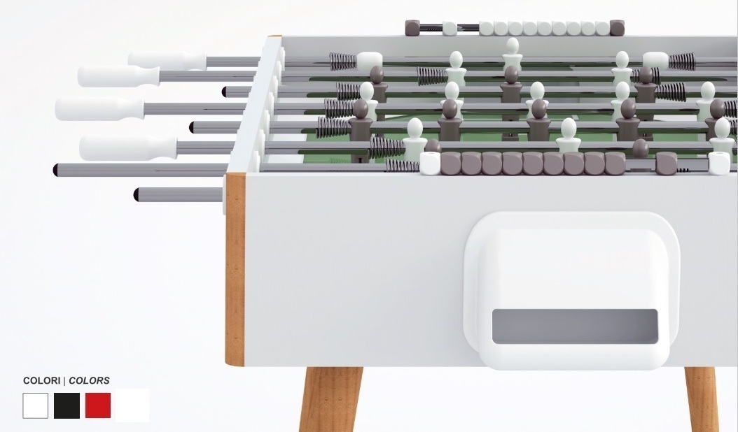 The foosball table Flamingo by FAS is design by Italian design-office Basaglia & Rota Nodari and suits perfect for every leisure-room or office. The angled wooden legs are equipped with black feet and provide a firm stance. The handles are the same color as the corpus. The ball-return is installed behind the goals. The manual scoring-units are on top of the goals. The hollow-bars are equipped with design-figures, security-caps and spring-bumpers. The playing surface has superimposed banks and edges.