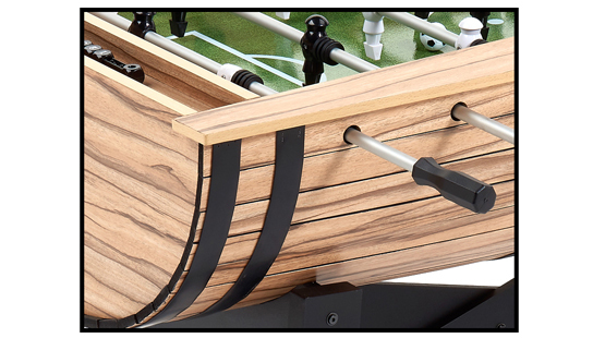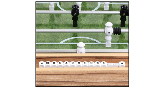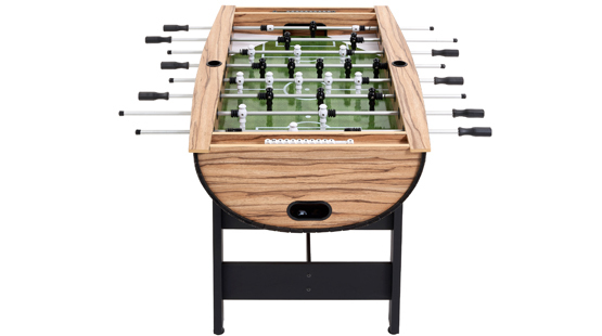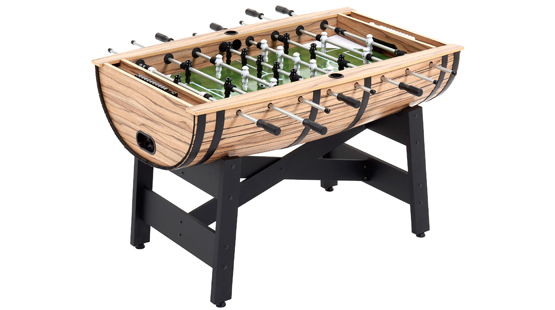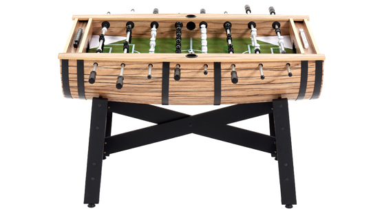 The foosball table Barrel is unique on the market. The matchless overall concept reminds on a wooden barrel, which is well known from beverage industry of yesteryears. The combination of oak-wood finishing and the black metal hoops at the circumference of the carcass is authentic and harmonious. The rustic sub-construction of black wooden boards complete the concept. The foosball table will be the highlight of every wine cellar, bar or restaurant. In addition to the unique design, the table convinces by optimal game play conditions which are guarenteed by the steadiness and the use of high quality matt anodised rods. Also the black and white figures as well as the used handles can convince by durability. The wooden barrel is preassembled, so only a few steps of the assembly instructions have to be observed until the gaming fun can begin. To start playing right after mounting the table, 2 balls are included in delivery.