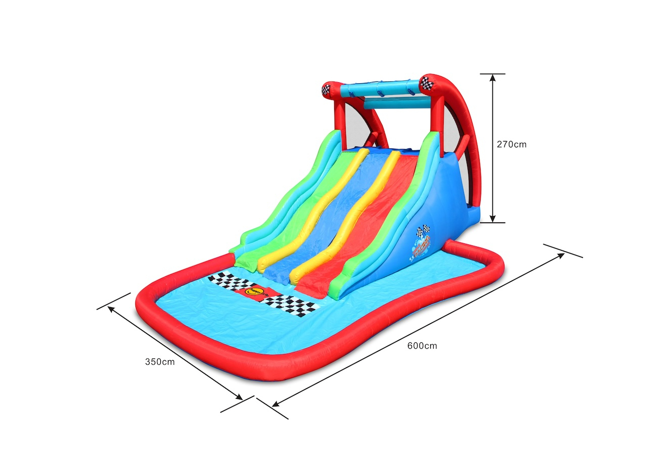 Erfüllen Sie Ihrem Kind den Wunsch in einer Hüpfburg zu springen. Mit der Triple Racing Thunder von HappyHop haben Sie die perfekte Einsteiger Hüpfburg für Ihren Garten gefunden. Optimal für die Einschulung, die Geburtstagsparty oder Ihren Garten, eine Hüpfburg ist immer ein Highlight. Diese kann in nur einer Minute aufgeblasen werden, einfach ausbreiten, Gebläsemotor anschließen und mit den Heringen am Boden verankern. Alle Versionen werden inklusive Gebläsemotor, Heringe, Tragetasche und Reparaturset geliefert.