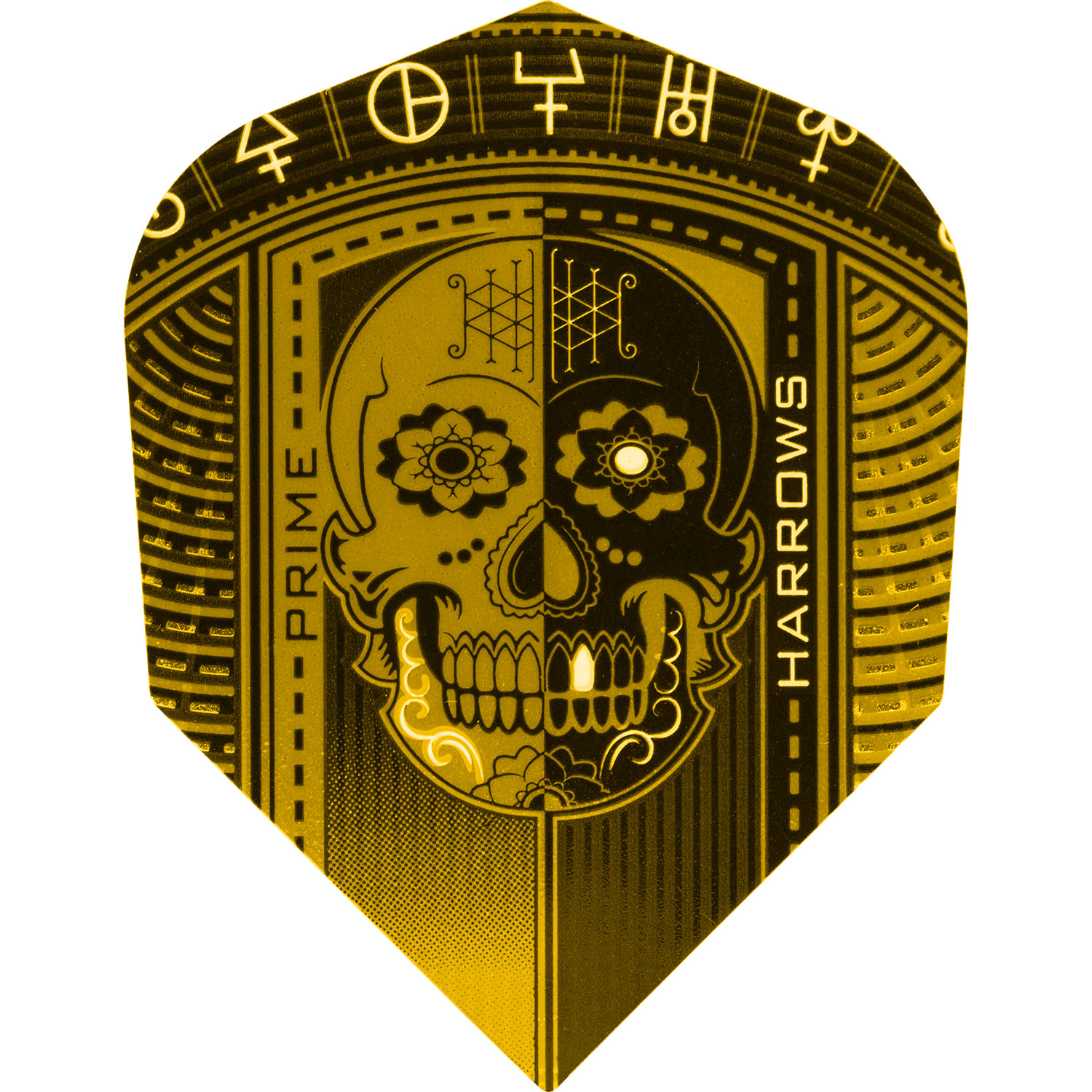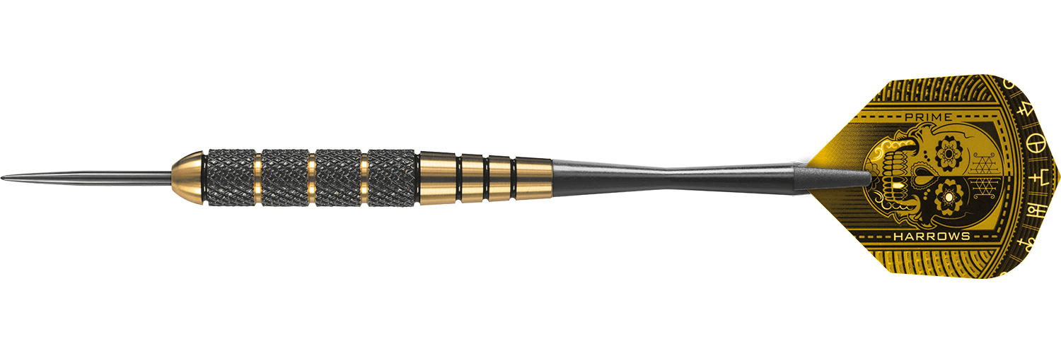 The Harrows Voodoo 25 gram darts live up to their name with mystical characters and a skull on the Marathon Gold flights. The black knurled barrel of the Harrows Voodoo steeltip brass darts provide a good grip and high control over your throw.