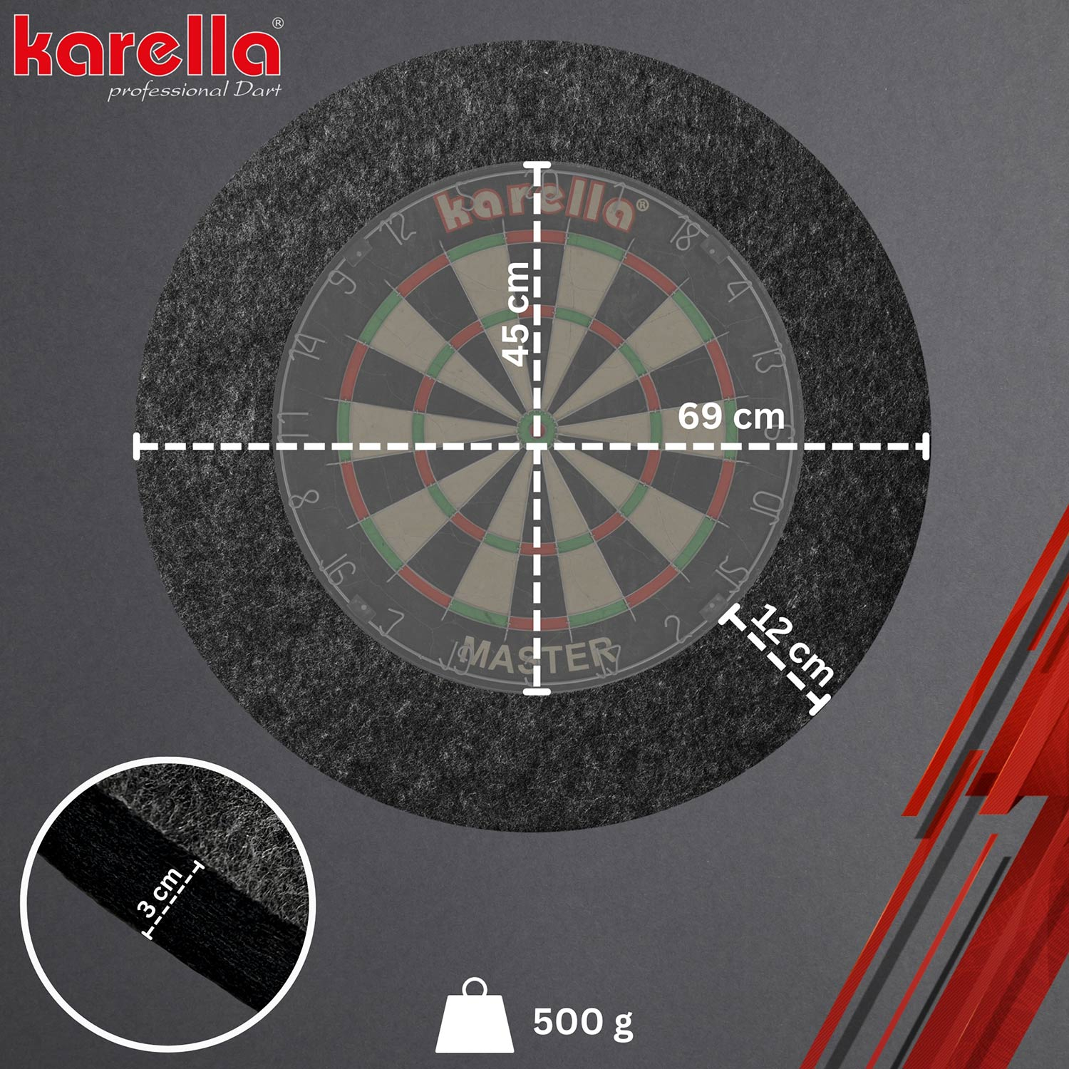 The first dartboard catch ring Made in Germany that is Oeko-Tex certified. With the one-piece Ultimo catch ring, Karella uses a completely new material. The Karella Ultimo catch ring is made of recycled fibers, 100% free of harmful substances and completely without chemical additives. The material was pressed to the ideal density using a specially developed manufacturing process. This unique structure ensures that steeltip darts stay in the ring in case of a wrong throw and do not penetrate the catch ring. This ensures that the wall and floor are protected and removal of the darts is easy. After removing the darts, no visible marks remain on the gray, non-reflective surface. The Oeko-Tex certified material of the Karella dartboard catch ring Ultimo is unique in the sport of darts.