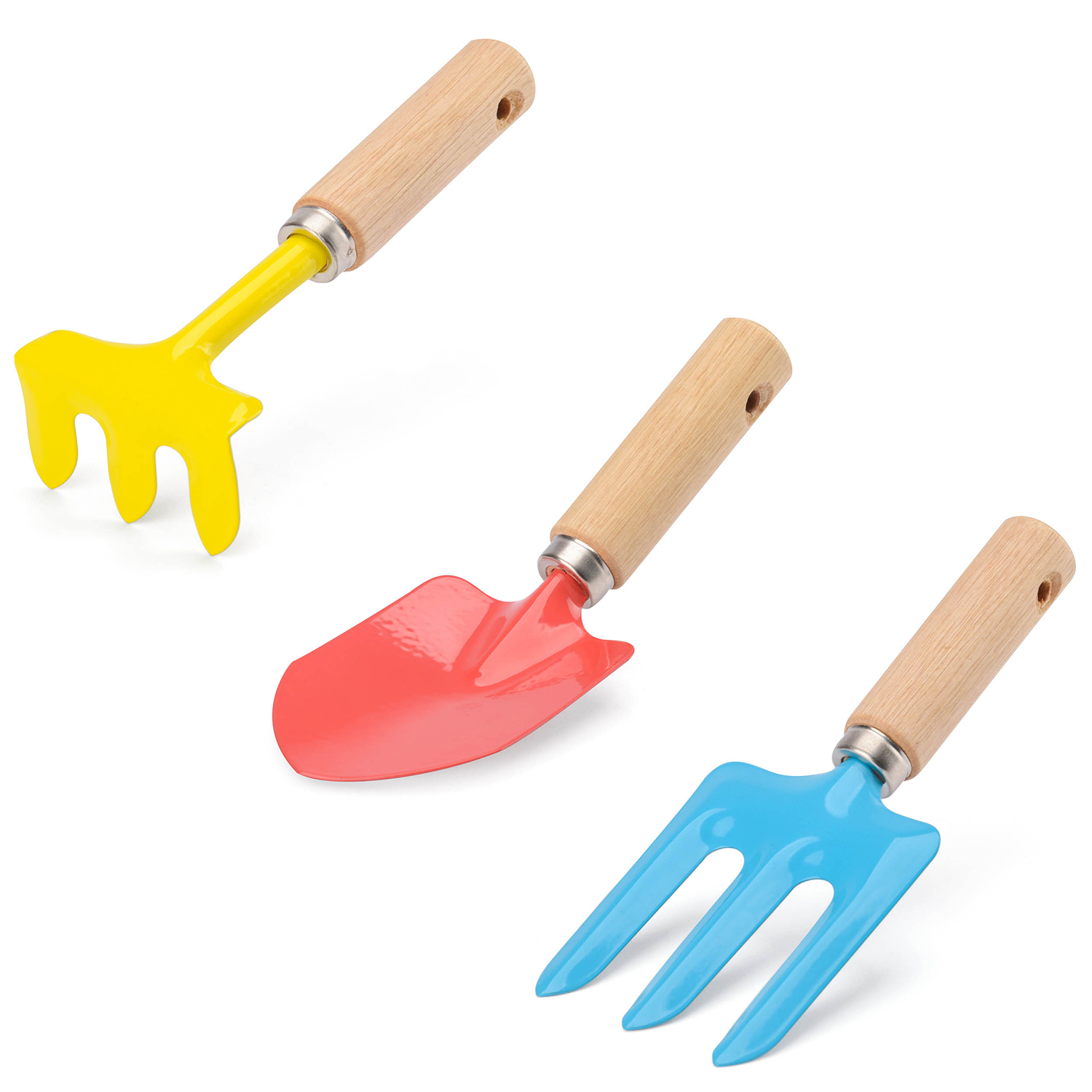 Kinder tuingereedschapsetMateriaal: hout, kunststof en metaaBevat: gieter, vork, hark, schep, tuinhandschoenen en een draagtas.Lengte gereedschap: 16 cmAfmetingen tas: 22,5 x 12 x 17 cm (L x B x H)Aanbevolen leeftijd vanaf 3 jaar