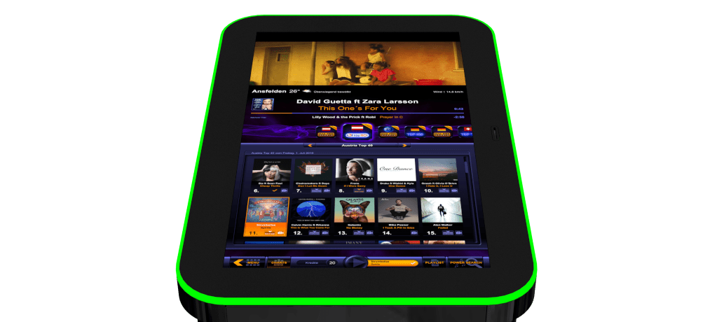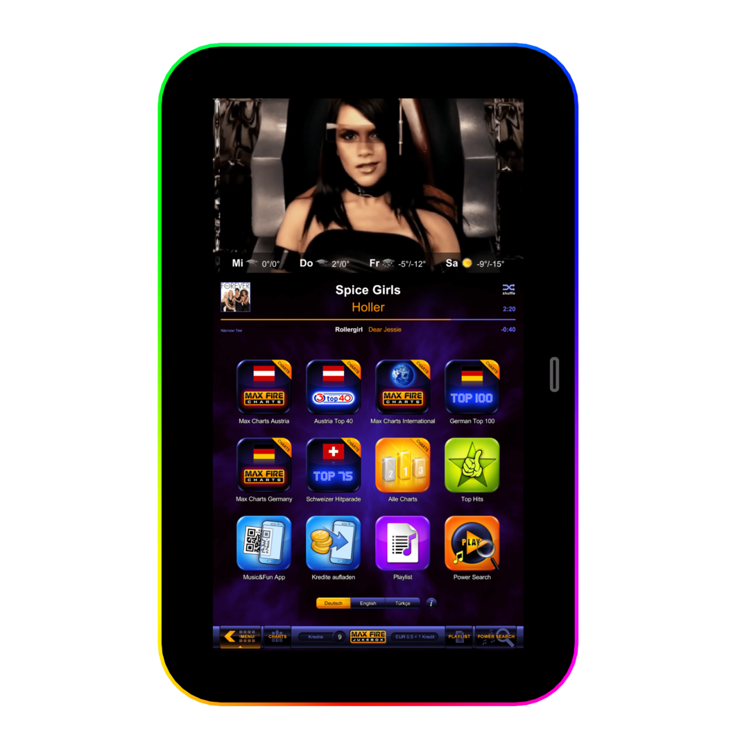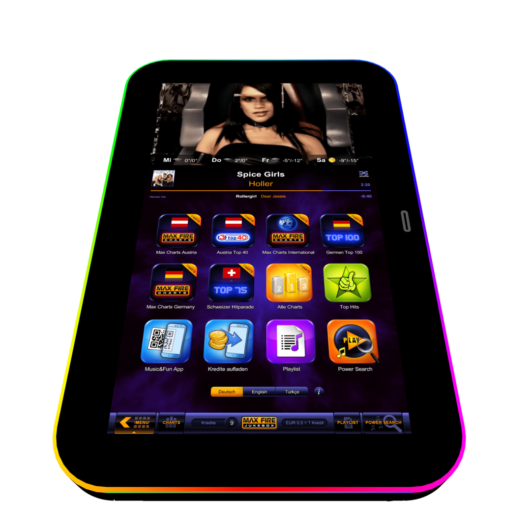 The MaxFire Jukebox HD+ leaves nothing to be desired. The preinstalled music library includes the current hits of the charts as well as the greatest songs of the music-history. To customize the local database, the Jukebox is connected to an enormous online library with hundrets of thousands songs which can be downloaded with costs. The person who runs the box holds the upperhand over the system by blocking music as well as sound settings. In addition to the tracks, a great number of music-videos is available too. The videos can be watched on the high definition 32 inch touchscreen or be transmitted to other devices. Another highlight is the interface to smartphones. The opportunity to adapt the playlist with the mobilephone is going to be unlocked by booking the Online Terminal Management (OTM). Other advantages of the extension with OTM are automatic updates of the system, implementation of the current charts as well as the option to show any desired advertise. The MaxFire Jukebox HD+ convinces not only with inner values, even the outer values are worth considering. The fresh and modern design around the touchscreen with very bright and high-contrast colours makes the music automata to an eye-catcher at every bar and club. The MaxFire is equipped with a coin validator by default. In addition, a bank note validator is available on demand. To get a perfect sound scenery we recommend the music-box with the optional 2 way amplifier.