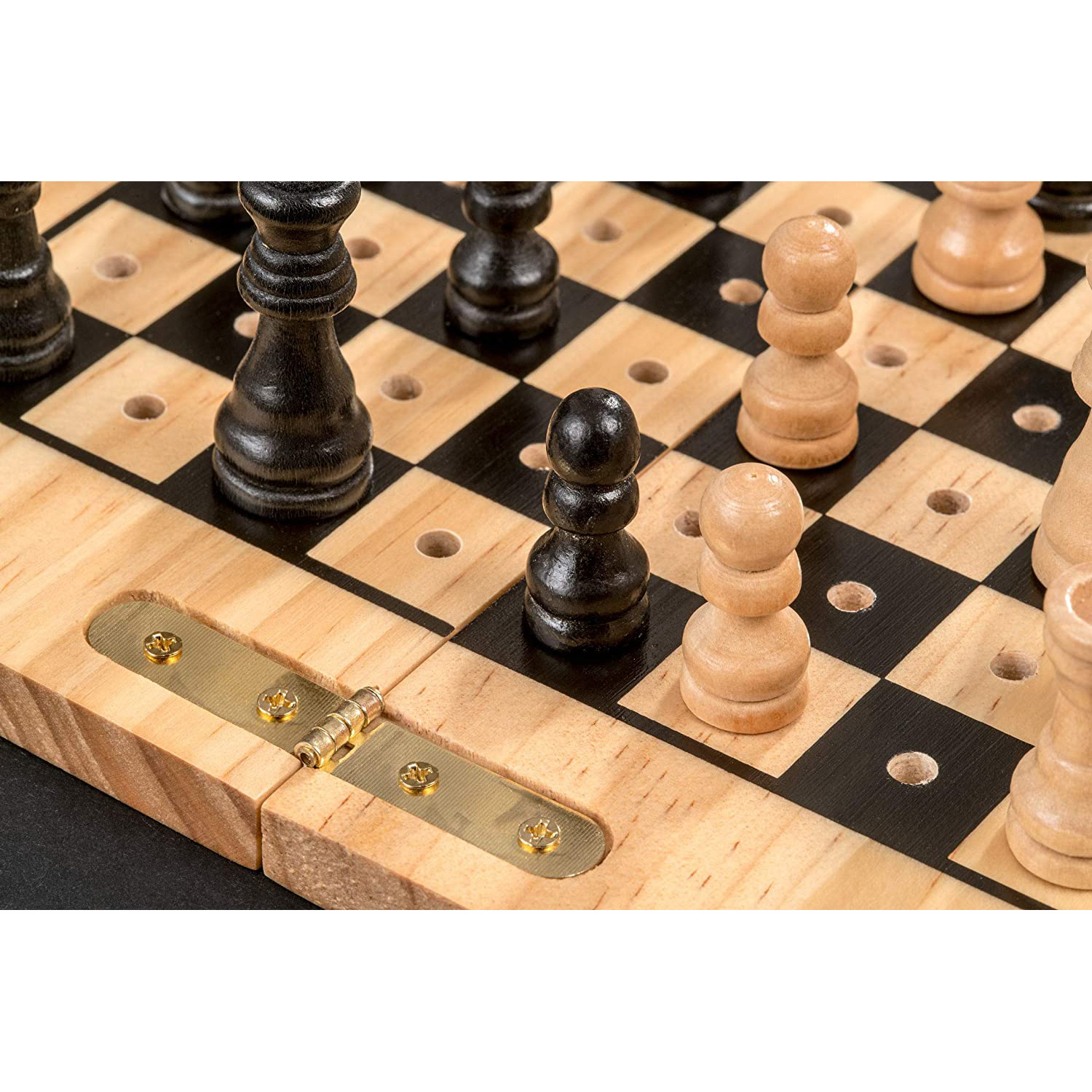 The chess pieces of this Philos travel chess game are equipped with a pin with which you fix them in the game board. This way the pieces will not move and the chess game can be played anywhere. The Philos wooden chess game has a game board with a field size of 19 mm. The chess pieces have the Staunton design and the size of the king is 50 mm. Not suitable for children under three years of age due to small parts.