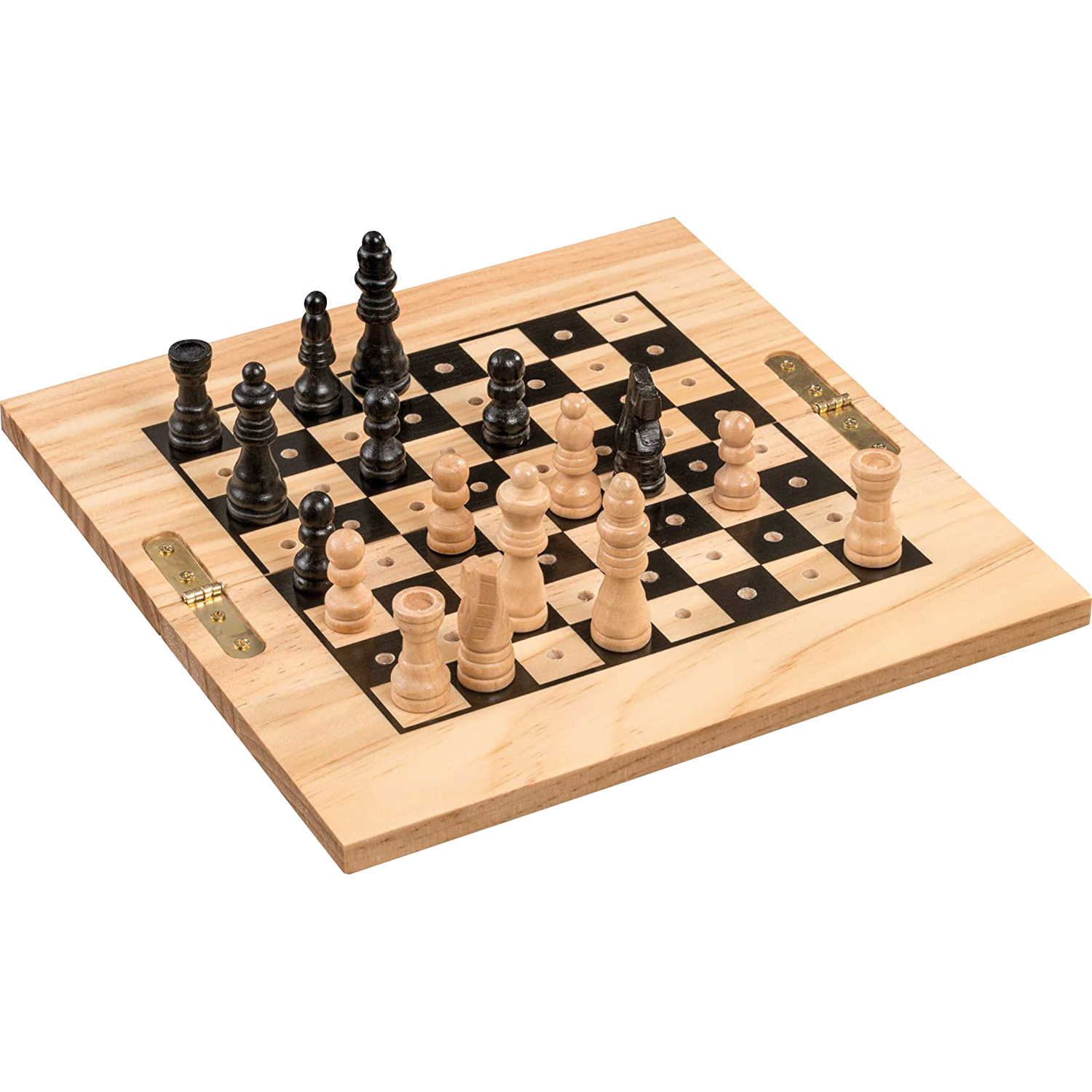 Rock chess game with pinMaterial cassette/ game board: pine wood, natural & black printedField size: 19 mmMaterial chess pieces: cypress wood, natural and black coloredDesign chess pieces: StauntonSize king: 50 mmAdvised age: 6 years and upDimensions (closed): 215 x 110 x 20 mmDimensions (open): 215 x 220 x 10 mmMark: Philos