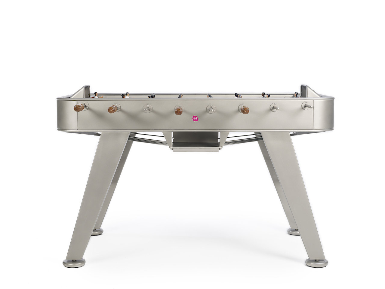 The RS#2 is a high quality design foosball table made by RS Barcelona. The fashionable appearence is created by the designer Rafael Rodriguéz and is a reinterpretation of a RS Barcelona cultural classic model. The usage of premium materials makes the table to an eyecatcher in every appartment or office. In search of a high-class outdoor foosball table the perfect product is offered here. Depending on the corpus material the table suits well for either indoor- (stainless steel) or outdoor- (Inox) usage. Furthermore the corpus is coated nealty with polyester paint and is available in different colours. To have a harmonious general image of the table, a stable leg construction in the same material and paint with plate-feet is mounted at the downside of the corpus. In addition to that, the table convinces due to lovely details like hand-painted aluminium cast figures with arms and alternative one or two legs, as well as noble wooden handles. Not only the design of the table inspires, even the foosball game play conditions in a sense of Spanish point of view thrills the players. The playingfield is HPL-coated, bended to the middle and has seamlessly lifted corners. The manual counting unit is attached behind the goals, next to the cup-holders of the RS#2.