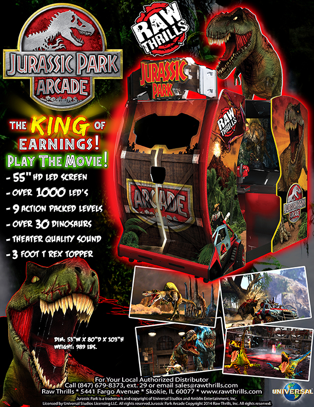 Der Spielautomat Jurassic Park bietet ein actiongeladenes Spielerlebnis für 1 oder 2 Spieler. Die Spieler versuchen mit Hilfe von Betäubungsgewehren die ausgebrochenen Dinosaurier einzufangen. Der hochauflösende 55" LCD-Bildschirm liefert dabei gestochen scharfe Bilder.
