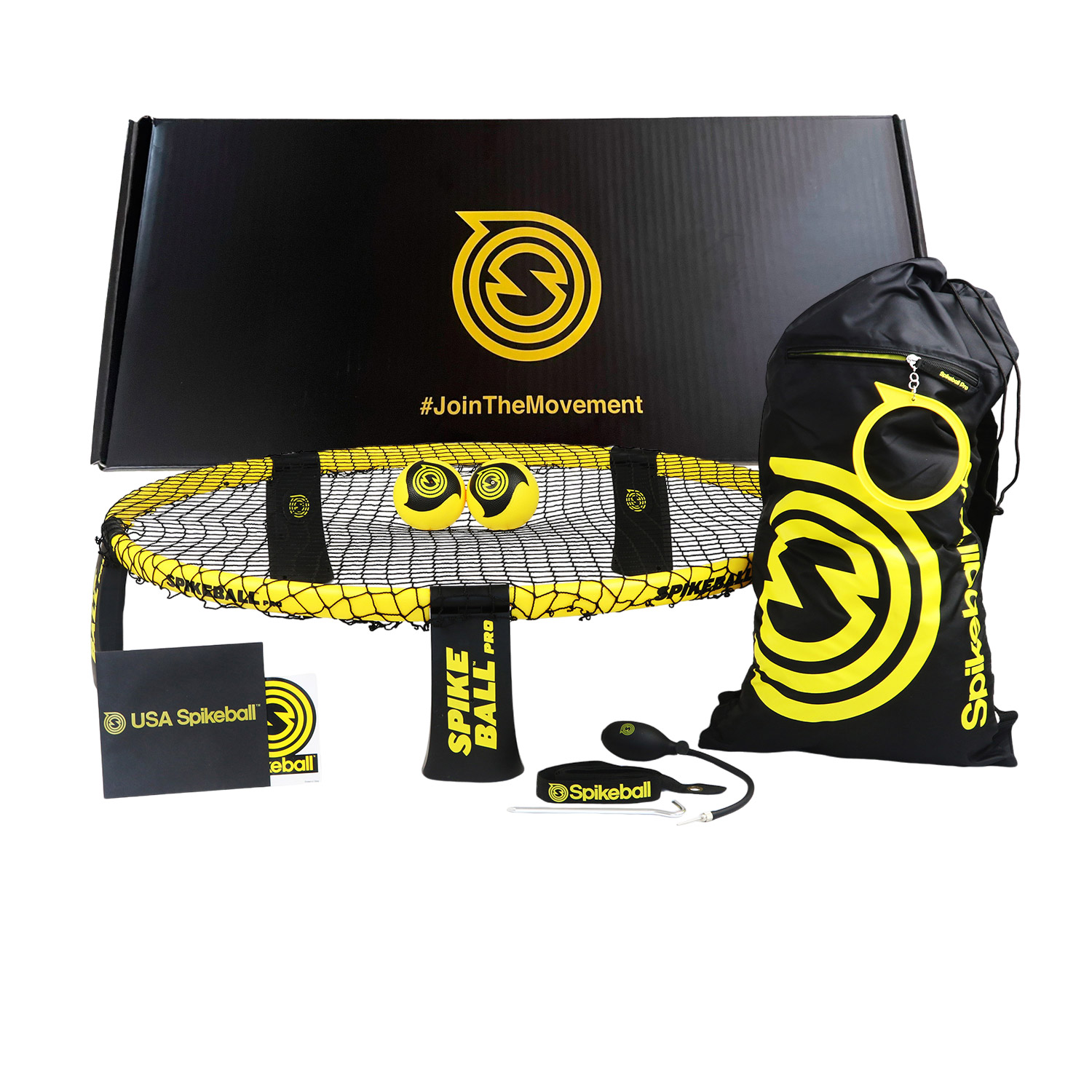 The Spikeball Pro Set is now available in the exclusive Black Box Edition, where the only difference from the standard Spikeball Pro Set is the packaging, a minimalist, stylish black box with yellow Spikeball logo. Are you an avid roundnet player looking for the best equipment for your matches? The Spikeball Pro Set is specially designed for the serious and advanced player who wants to get the most out of his game. Often used in official roundnet tournaments, this set offers everything you need to take your game to the next level. The Spikeball Pro Set stands out for its sturdy and stable construction. The playing net is extra sturdy and stays taut even during the most intense games. The non-slip rubber coating on the legs ensures that the net remains stable on all surfaces, whether you are playing indoors or outdoors. The Spikeball Pro balls feature a textured surface, which provides more spin and better ball control. With the included pump, you can easily adjust the air pressure of the balls, so you are always ready for perfect smashes and accurate drop shots. Spikeball is an active and competitive game that combines elements of volleyball and four square. The game is easy to set up and can be quickly stored away after the game is over. Thanks to the handy backpack with padded shoulder straps, you can take the set anywhere. Whether you want to play on the beach, in the park, or just in your own backyard, the Spikeball Pro Set is always ready for action. Want to play with others? Download the free Spikeball app to connect with players in your area. That way, you never have to spend a long time searching for opponents and you can always enjoy a challenging match. Choose the Spikeball Pro Set and experience the difference during your next roundnet match. With this set you are guaranteed top quality and optimal playing fun wherever you are!
