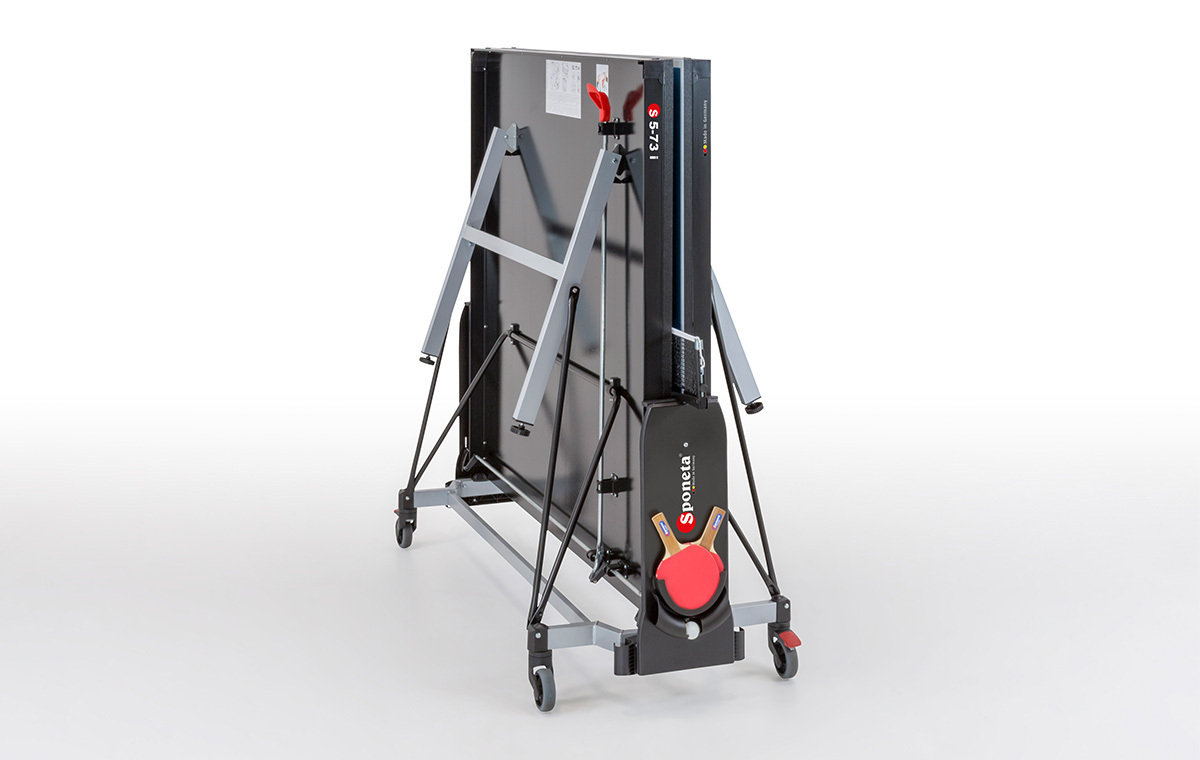 The Sponeta table tennis tables are all produced in Germany convince by their excellent quality and perfect playing conditions. The high-quality coating of the fine chipboard guarantees an optimal ball bounce, which also gives professional table tennis players a great advantage. All models are delivered with a fitting net and correspond to the official tournament measurements of a length of 274 cm , width of 152,5 cm and a height of 76 cm . The tables differ essentially in the base frame, the folding mechanisms, the plate thickness and the weight. The highlight is the SMS locking system, which enables the operator to set up and dismantle the table tennis table at lightning speed. The abbreviation stands for Smart Manual System, which lives up to its name and convinces with a smart mechanism.