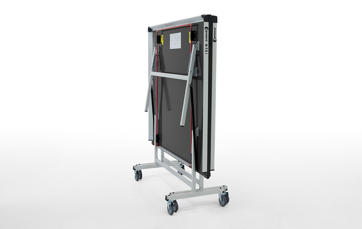 The Sponeta table tennis tables are all produced in Germany convince by their excellent quality and perfect playing conditions. The high-quality coating of the fine chipboard guarantees an optimal ball bounce, which also gives professional table tennis players a great advantage. All models are delivered with a fitting net and correspond to the official tournament measurements of a length of 274 cm , width of 152,5 cm and a height of 76 cm . The tables differ essentially in the base frame, the folding mechanisms, the plate thickness and the weight. The highlight is the SMS locking system, which enables the operator to set up and dismantle the table tennis table at lightning speed. The abbreviation stands for Smart Manual System, which lives up to its name and convinces with a smart mechanism.