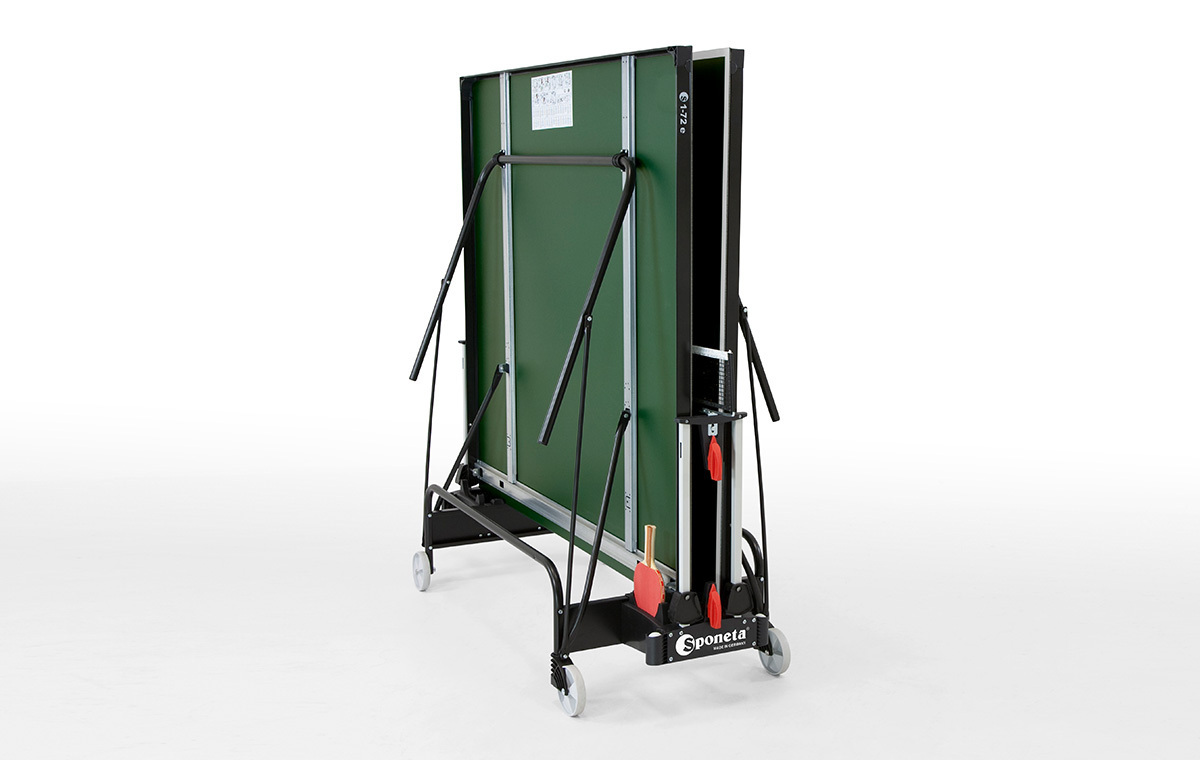 The Sponeta Outdoor Table Tennis Tables are all produced in Germany and convince by their excellent quality and perfect playing conditions. The high-quality coating of the melamine resin board guarantees an optimal ball bounce, which also gives professional table tennis players a great advantage. All models correspond to the official tournament dimensions of a length of 274 cm, width of 152.5 cm and a height of 76 cm and are delivered with a matching net. The tables differ essentially in the base frame, the folding mechanisms, the plate thickness and the weight. The highlight is the SMS locking system. The abbreviation stands for Smart Manual System, which lives up to its name and convinces with a smart mechanism. This enables the operator to set up and dismantle the table tennis table in a flash.