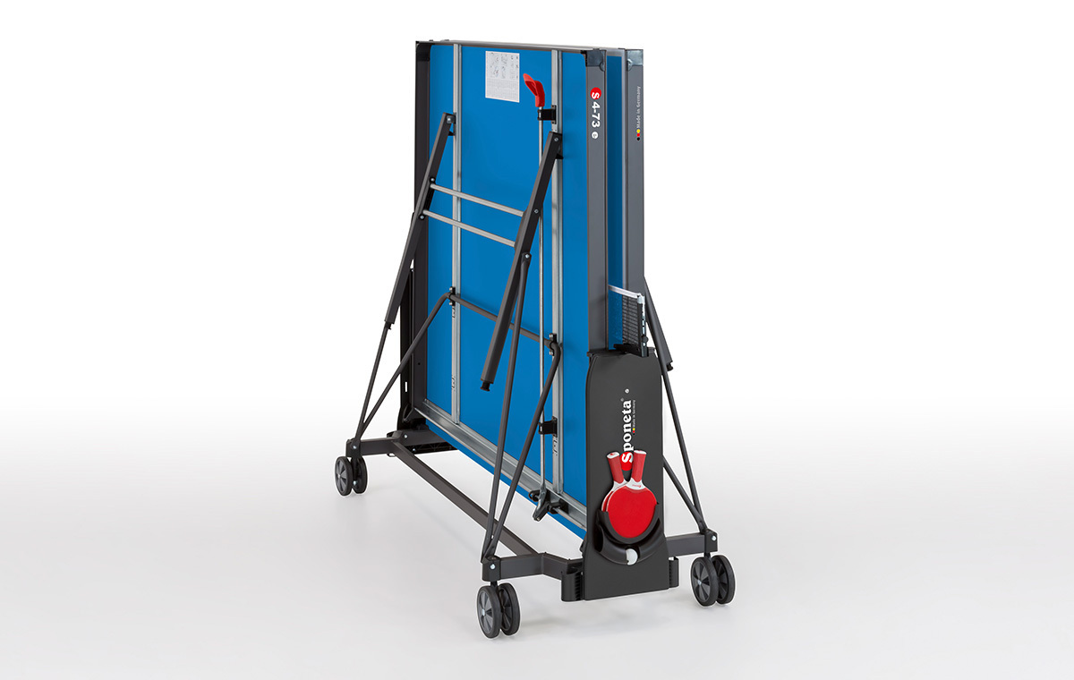 The Sponeta Outdoor Table Tennis Tables are all produced in Germany and convince by their excellent quality and perfect playing conditions. The high-quality coating of the melamine resin board guarantees an optimal ball bounce, which also gives professional table tennis players a great advantage. All models correspond to the official tournament dimensions of a length of 274 cm, width of 152.5 cm and a height of 76 cm and are delivered with a matching net. The tables differ essentially in the base frame, the folding mechanisms, the plate thickness and the weight. The highlight is the SMS locking system. The abbreviation stands for Smart Manual System, which lives up to its name and convinces with a smart mechanism. This enables the operator to set up and dismantle the table tennis table in a flash.
