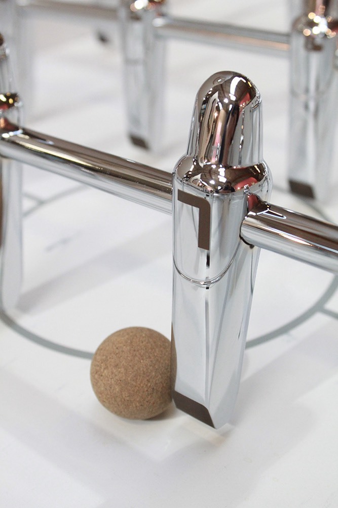 The design foosball table BlackBall by Toulet is made out of a stainless steel frame. The corpus is made out of a thermoplastic polymer shell and a thermoformed basin. The centralized ball return unit is integrated into the basin. The aluminium-handles as well as the Gerflex-coating provide the BlackBalls unique design. The chromed aluminium handles as well as the stainless steel goal frame round off the design. The 120kg weight guarantee a secure stance. Furthermore the BlackBall provides unique features such as LED-scoring-units or automatic goal-sensors.