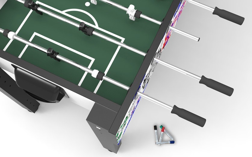 The Ullrich Basic Pro is the official youth-training-table of the DTFB. The special foldable, leg-construction is 3-level-height-adjustable which lets the table "grow" with the children. Furthermore the Basic Pro is equipped with height-adjustable feet which enables a firm stance even on tilted floors. The corpus is made from MDF and is melamin-coated. The ball return is behind the goal. Furthermore the manual scoring units are installed over the goal. There is a standard- and a premium-version available. The foosball table is delivered as concstruction kit.