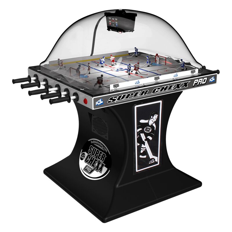 With the Super Chexx Pro, the manufacturer ICE delivers a very entertaining and high-quality ice hockey table from the Bubble-Games category. The game gets its name from the indestructible dome made of acrylic glass, which protects the player from flying pucks and the playing field from damage. The game is played similar to table soccer with rotating rods, but here each player is controlled individually. The dynamic game guarantees fun for young and old. The experience is supported by a video cube centrally above the playing field, which displays both the score and eye-catching animations. A further highlight of the table is the visual and acoustic background of the game. The realistic sounds provide a special game feeling and goosebumps atmosphere. The table can be played in 1-on-1 or in doubles with 4 persons. A game device that guarantees long-lasting pleasure. Due to the robustness as well as the integrated coin checker the Super Chexx Pro is perfectly suited for use in pubs and bars. In the production of the table the manufacturer falls back on decades of experience. Highest quality made in the USA since 1982. Matching the ambience, the aluminum housing with plastic base of the bubble field hockey game is available in red or black.