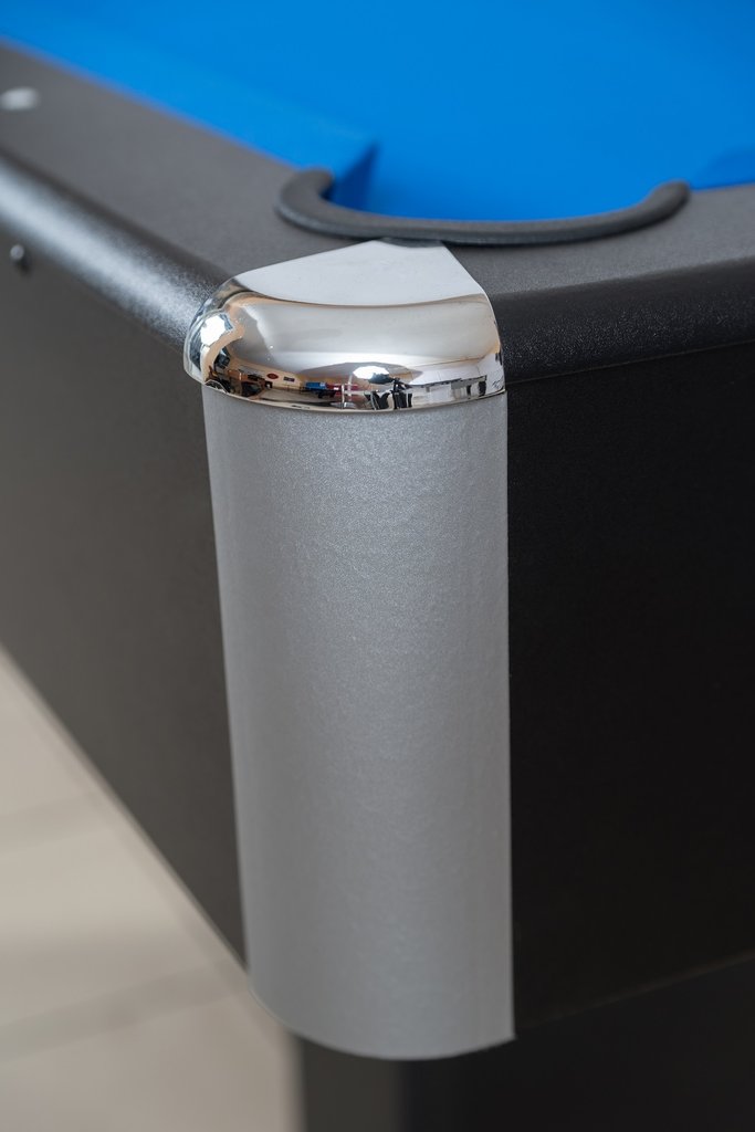Der Billardtisch Transfer bietet gute Stabilität und einen ordentlichen Kugellauf zu einem unschlagbar günstigen Preis. Das integrierte Kugelrücklaufsystem führt alle Kugeln zur einfachen Ballentnahme zur Stirnseite zurück. Die großen, gummierten Tellerfüße sind höhenverstellbar und sorgen somit für die einfache Austarierung. Die Tischkanten sind in Chrom-Optik gehalten. Die einfachen Gummi-Banden des Billardtisches (bereits mit Billardtuch überzogen), sorgen für den korrekten Bandenabschlag. Der komplette Billardtisch ist äußerst pflegeleicht und durch die mitgelieferte Bürste befreien Sie auch das Billardtuch nach dem Spielen schnell von Kreideresten, Fusseln oder Krümeln.