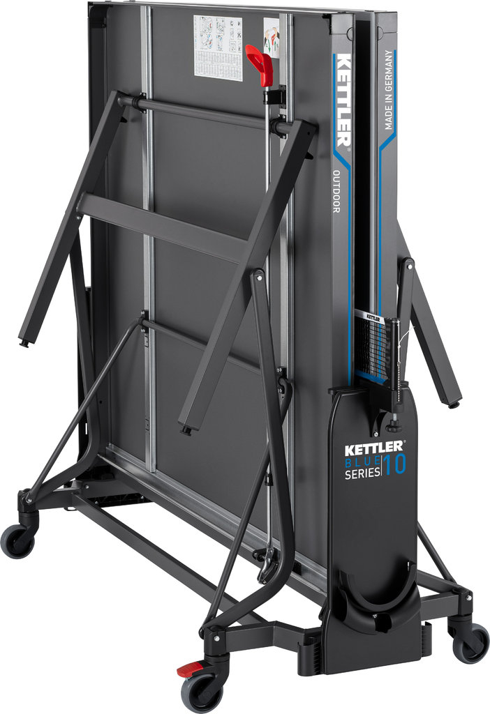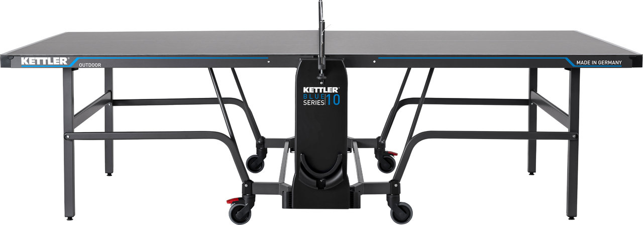 When looking for high-quality table tennis tables, one inevitably stumbles across the products of the Kettler company. The top model of the outdoor tables is the Kettler K10 Outdoor. The table is equipped with a weatherproof 6 mm thick and 25-fold coated melamine resin top, on which the non-glare and scratch-resistant coated playing surface is applied. The top is framed by a 50 mm high profile frame. A matching net set is supplied with the table, so that nothing stands in the way of playing fun. A cover is attached underneath each net holder, which serves as a storage space for rackets and balls. The very stable substructure made of steel tubes is supported by 4 steerable off-road double wheels. A practical folding mechanism is integrated into the substructure, which is very easy to handle thanks to the one-handed locking mechanism. The height-adjustable legs allow the table to be perfectly balanced, which is a basic requirement for a fair game.